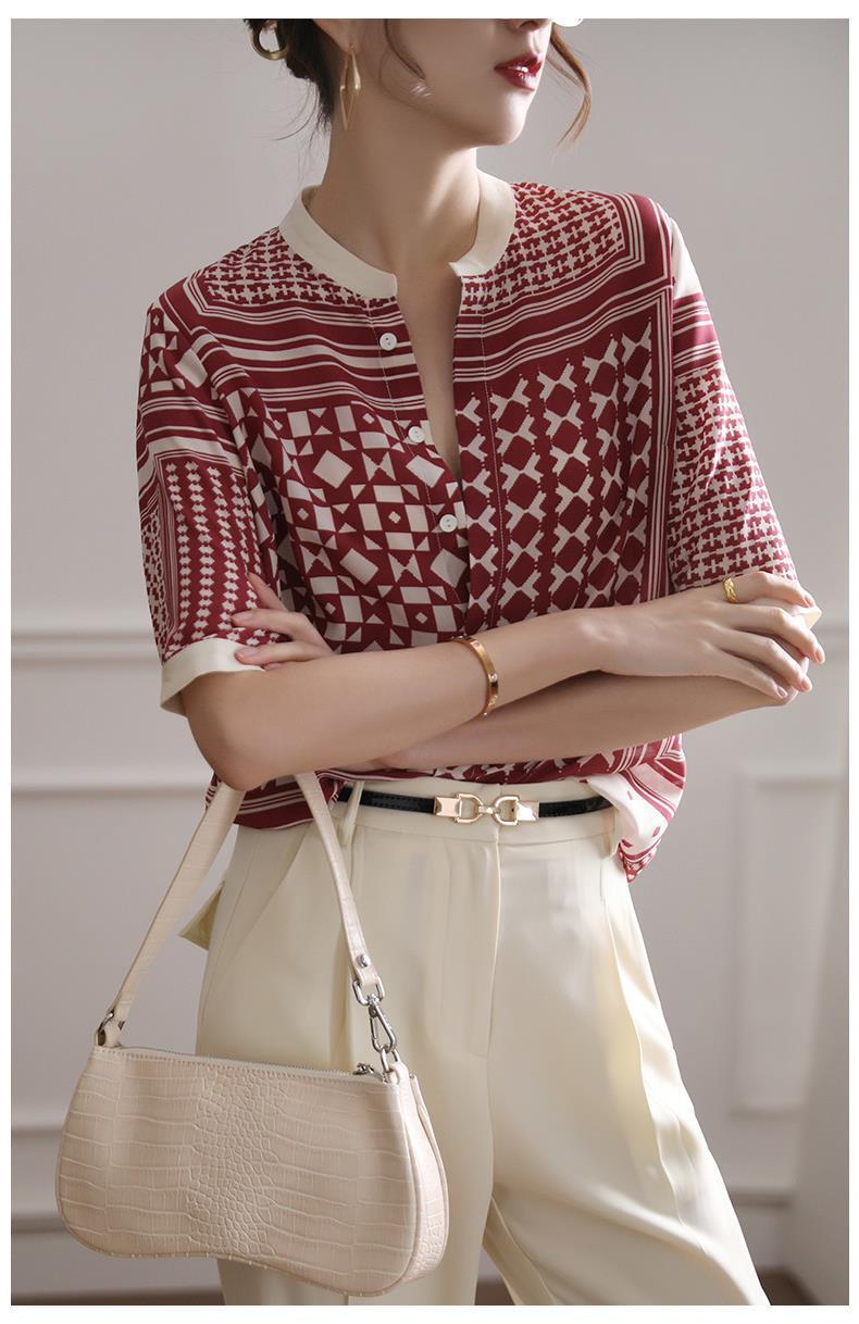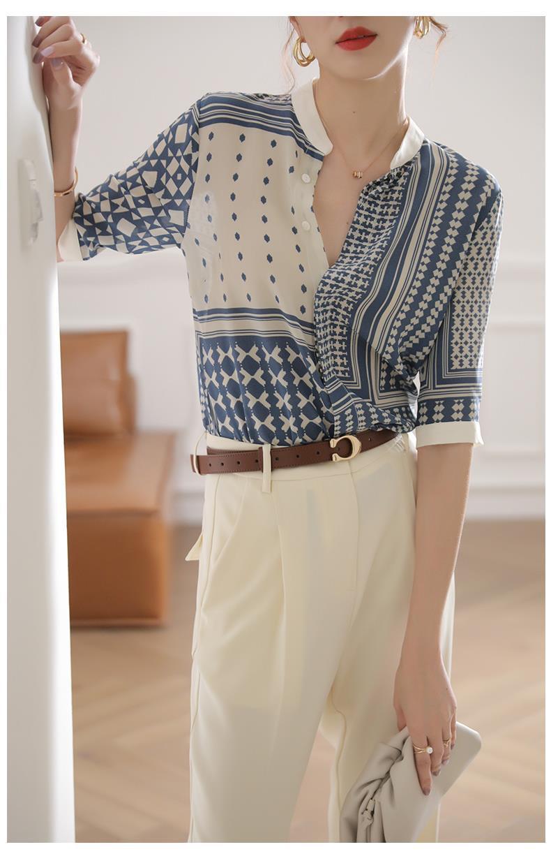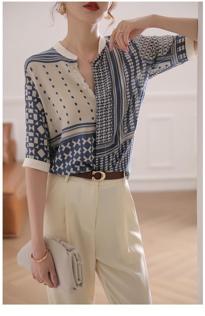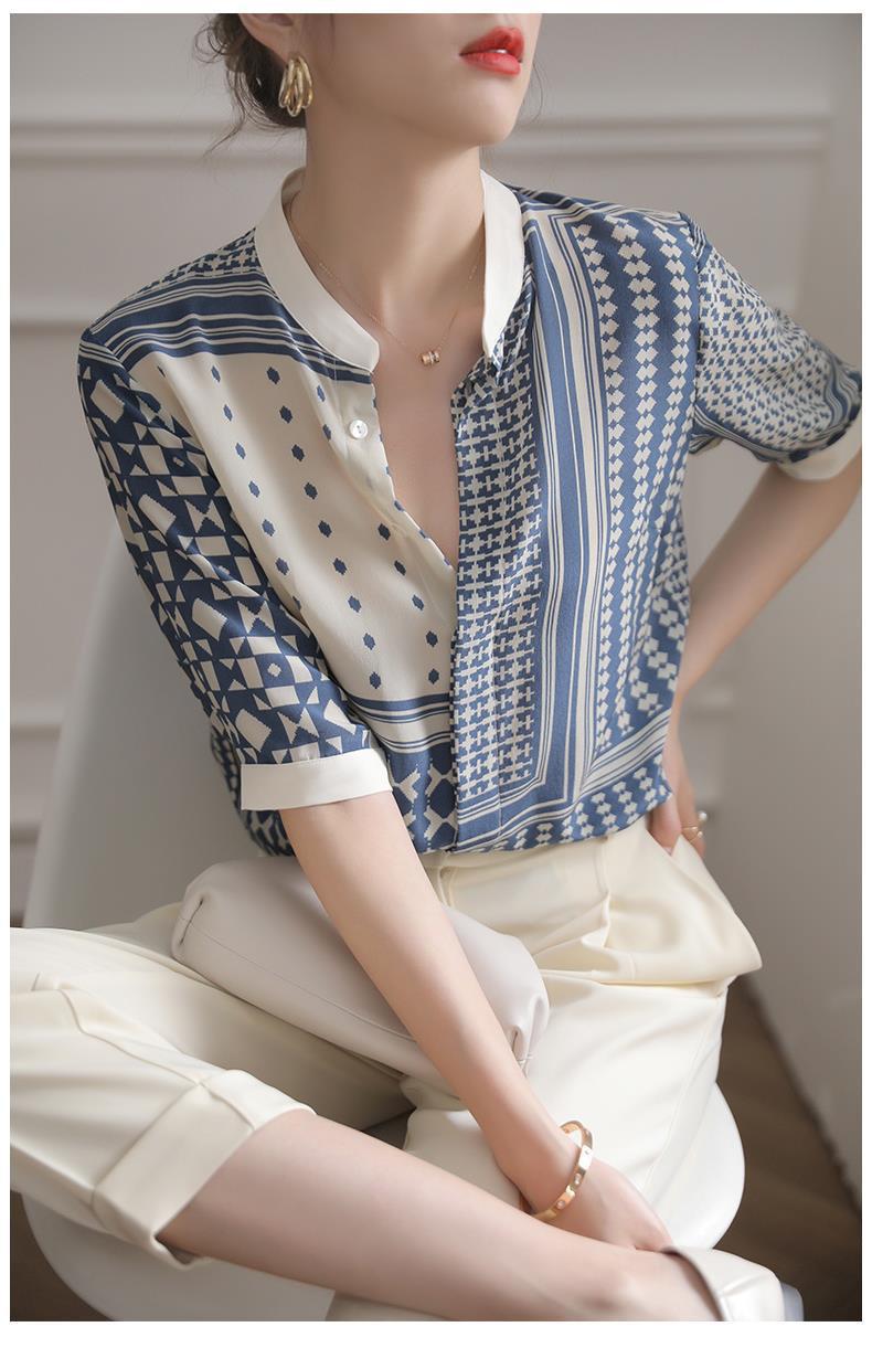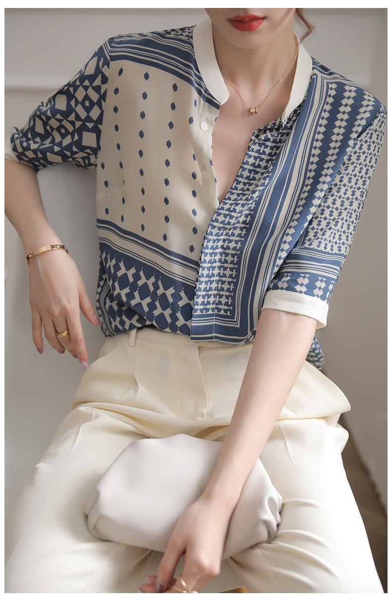 【满满设计感】法式真丝衬衫 中袖立领 复古格子条纹 设计感小众蚕丝上衣