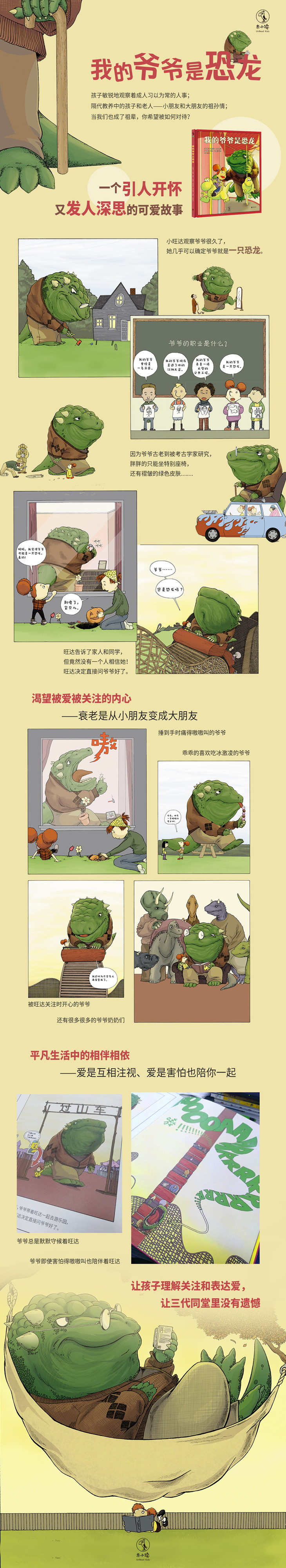 该绘本以3~6岁的小朋友为读者对象,用幽默又充满想像力的方式表达了对现代社会老年人的关注。小女孩旺达有一个大家庭,爸爸、妈妈、姐姐、弟弟还有一位古怪的爷爷。旺达观察爷爷很久了,她几乎可以确定她的爷爷就是一只恐龙,因为他的吼叫声、他的尾巴、他的绿色皮肤等等,都让爷爷看起来像是一只恐龙,旺达把她的发现告诉了家人和朋友,但他们都不相信她,为了解答疑惑,旺达准备直接询问爷爷。最后旺达去到爷爷的养老院才知道,原来爷爷并不是唯一的恐龙。