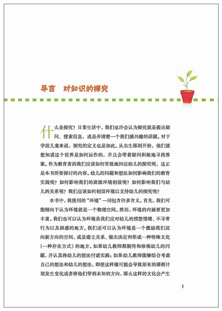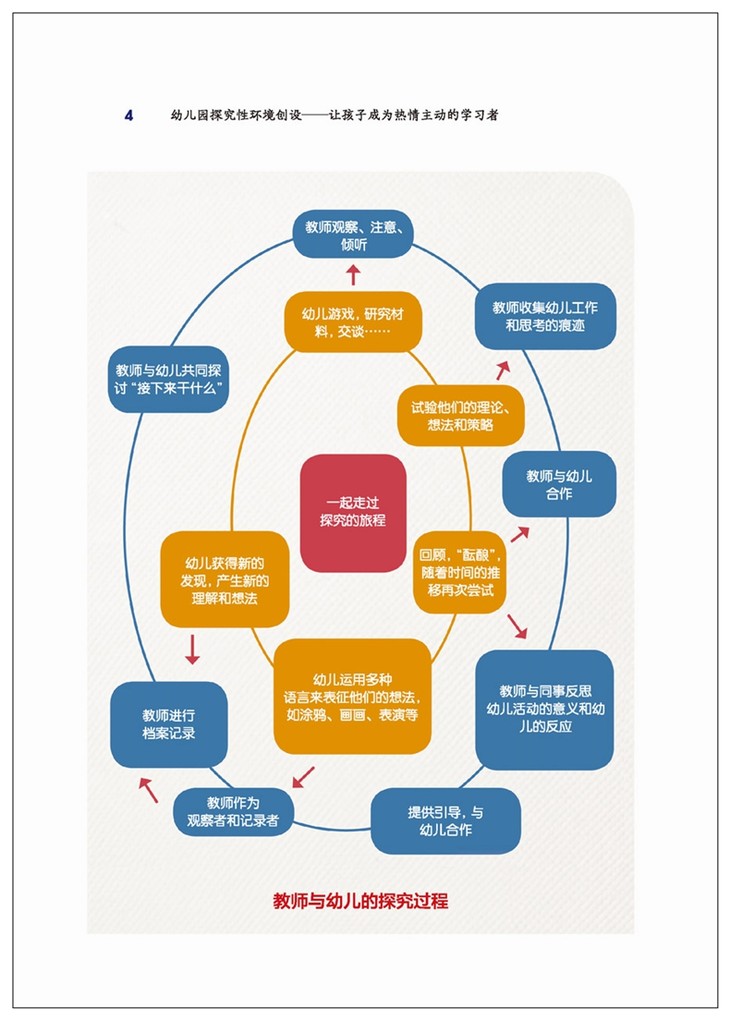 环境从来就不只是一种单纯的物质集合体,还是一种文化。在幼儿园环境创设方面,教师不仅要提供材料,还要创建一种能够支持幼儿探究的教育文化。本书几乎将这一理念诠释到了极致。本书作者没有论述探究性学习环境创设的抽象理论,而是对这种环境进行了具体而生动的描写,通过大量不同背景的真实的幼儿园教育情境来呈现这种环境,并将幼儿的好奇、冒险、创造性表达等与师幼合作、档案记录等支持策略结合起来,以?人与人”“人与物”的关系来构建其文化内核。这样的探索既是对瑞吉欧教育理念的一次有意义的实践,也是对探究学习理论的一次升华。