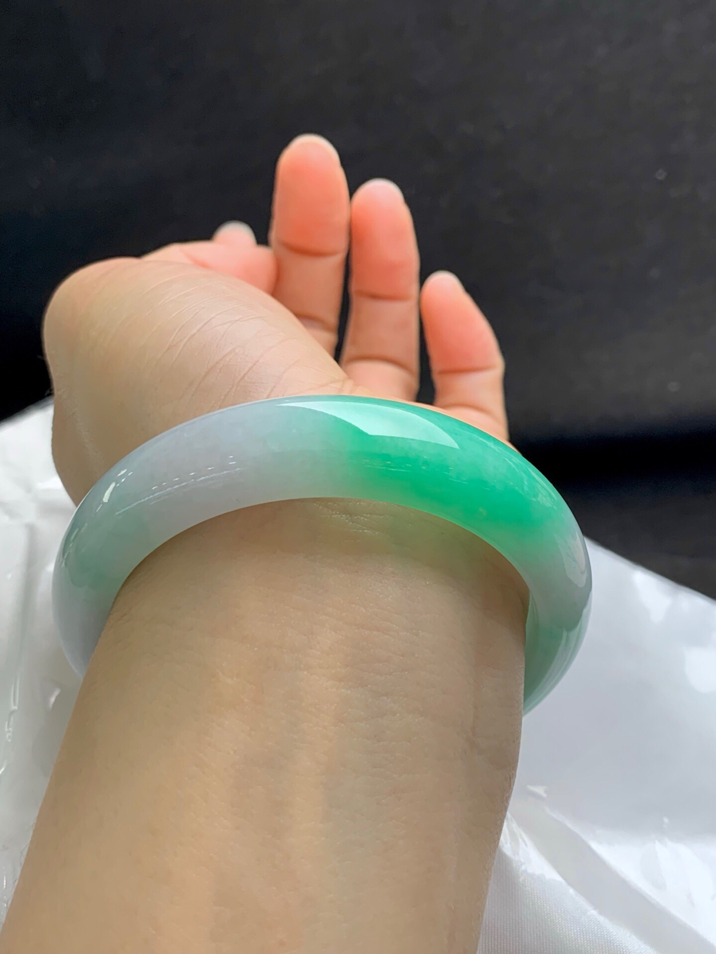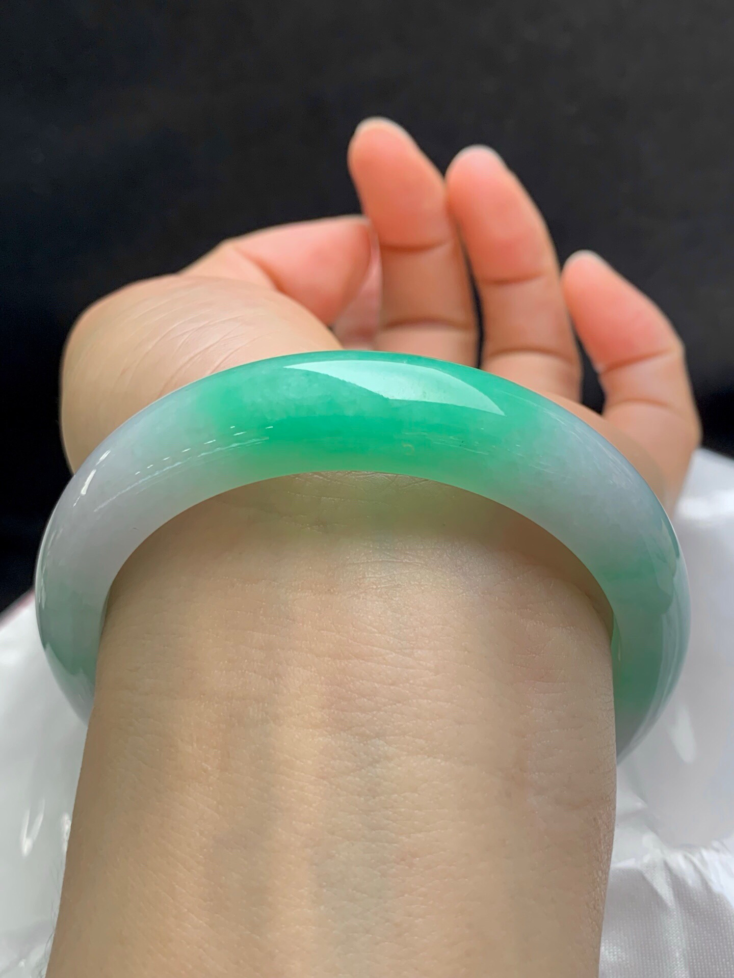 620402,58.8圈口,细糯化飘绿正圈平安镯,白底飘阳绿,底子细腻有水,完美,尺寸:58.8-13.9-8.5,超值价💰136500 #优石客珠宝#香玉荟萃