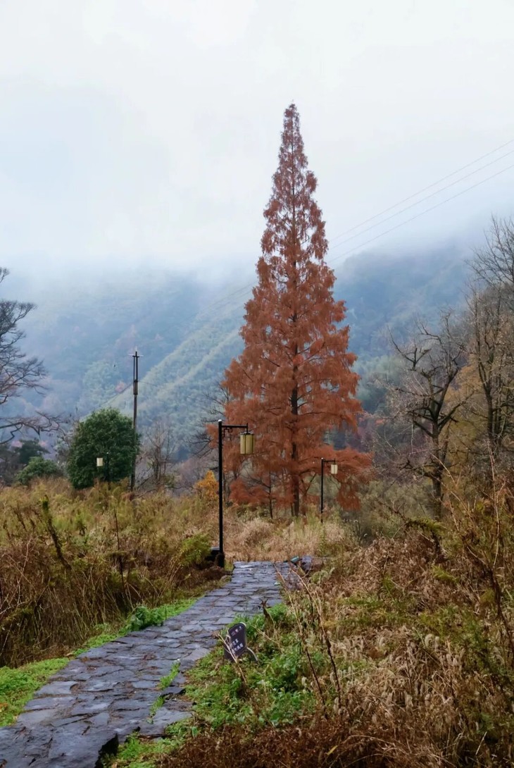 这里不仅有挺拔高耸的金钱松古树群,如剑指苍穹,秋季针叶金黄,璀璨夺目。还有深秋时节的绝对主角:枫香与银杏。