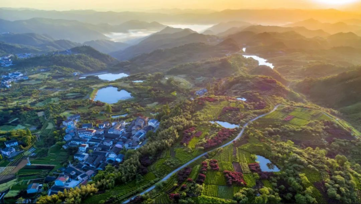 在霁月清风的浩大下,蓝天与群山相衬,村庄与潭水交织,质朴与烂漫,淡雅与华彩,山水相得益彰。