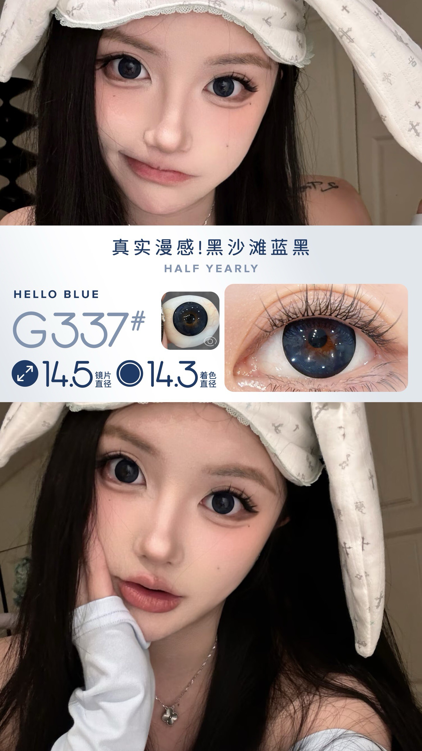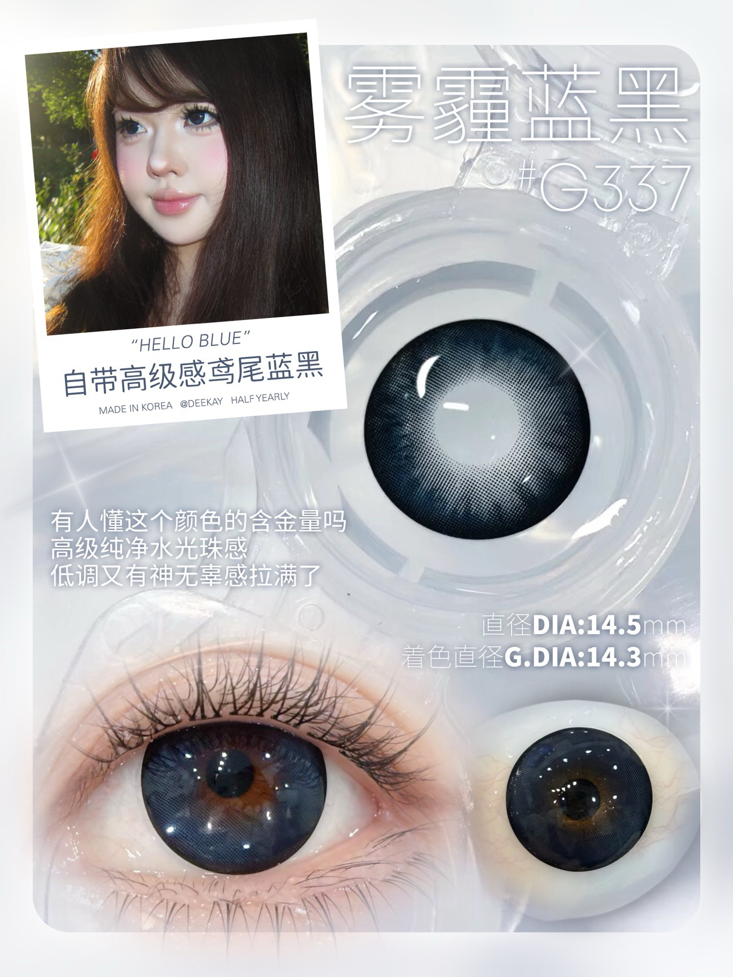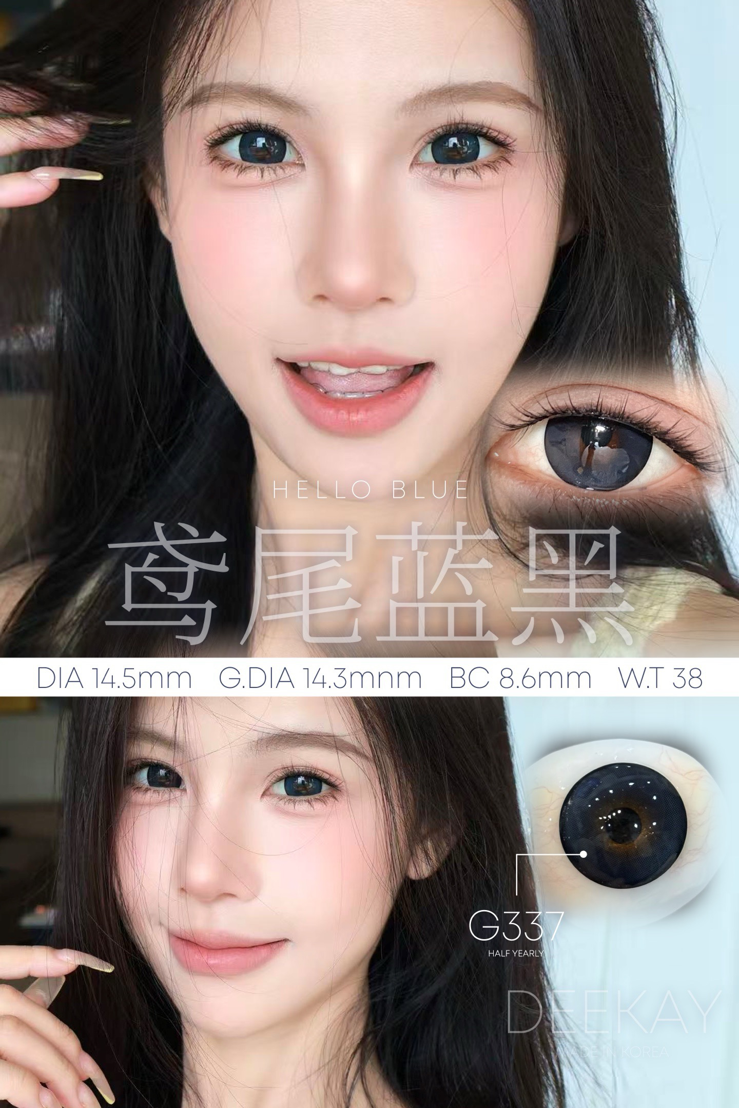 标注直径:14.5mm着色直径:14.3mm含水量:38%佩戴期限:半年型(建议六个月)可配:0-1000度(有525/575)韩产材质含硅水凝胶