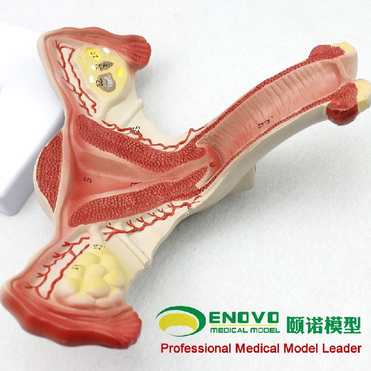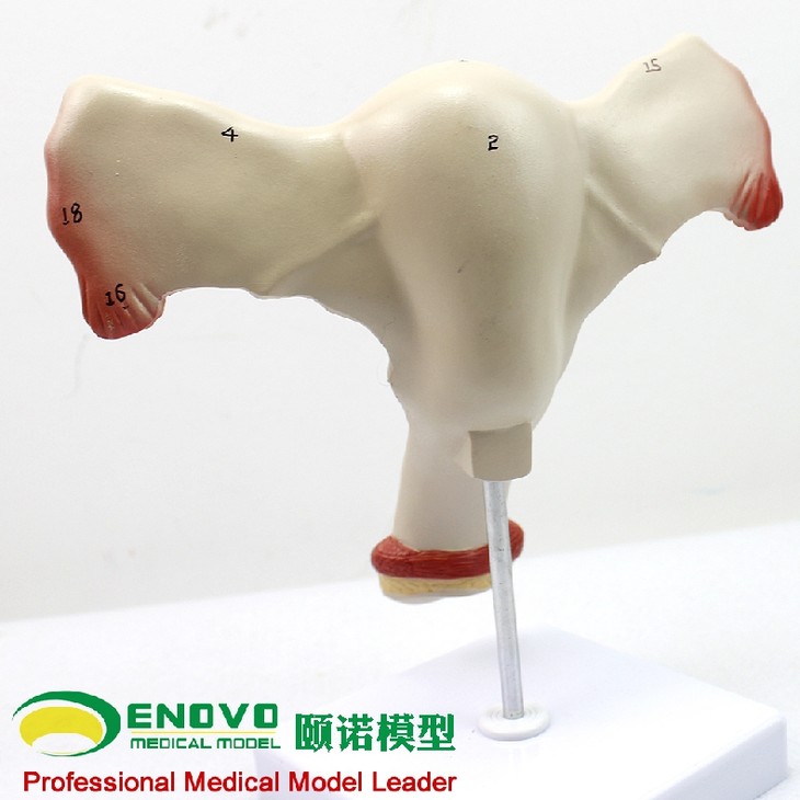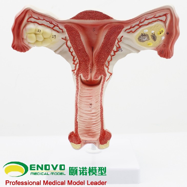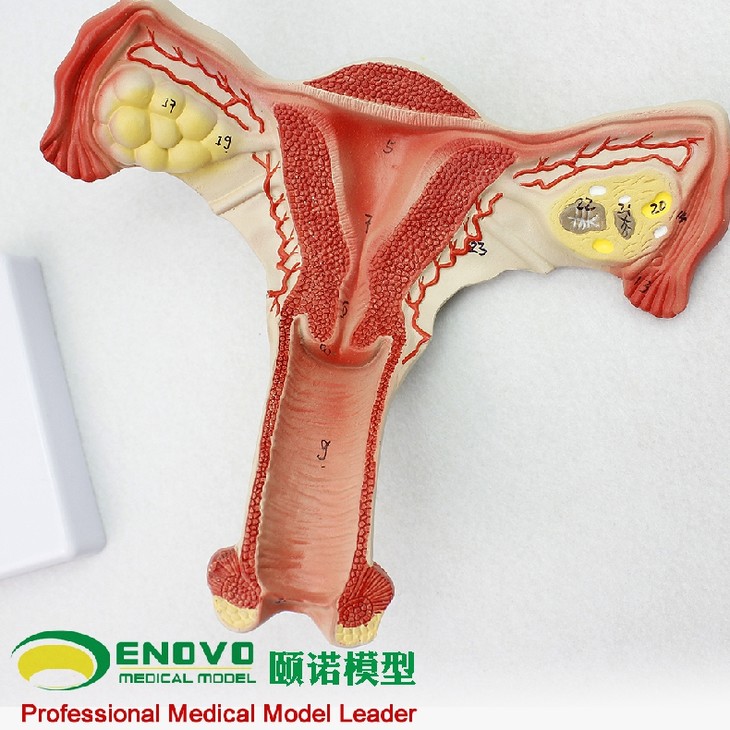 此产品详细的展示了,女性内生殖器的解剖结构,包括包括卵巢、输卵管、子宫、阴道和前庭大腺等,示子宫三层结构,子宫腔阴道示穹隆,左侧示卵巢、输卵管各部和子宫阔韧带的关系,右侧卵巢剖面示黄体、卵泡、子宫血管及子宫圆韧带等, 并且专业的设计了数字标识出了指示标识,更方便于使用者.是妇科教学不可多得的一款实际应用产品