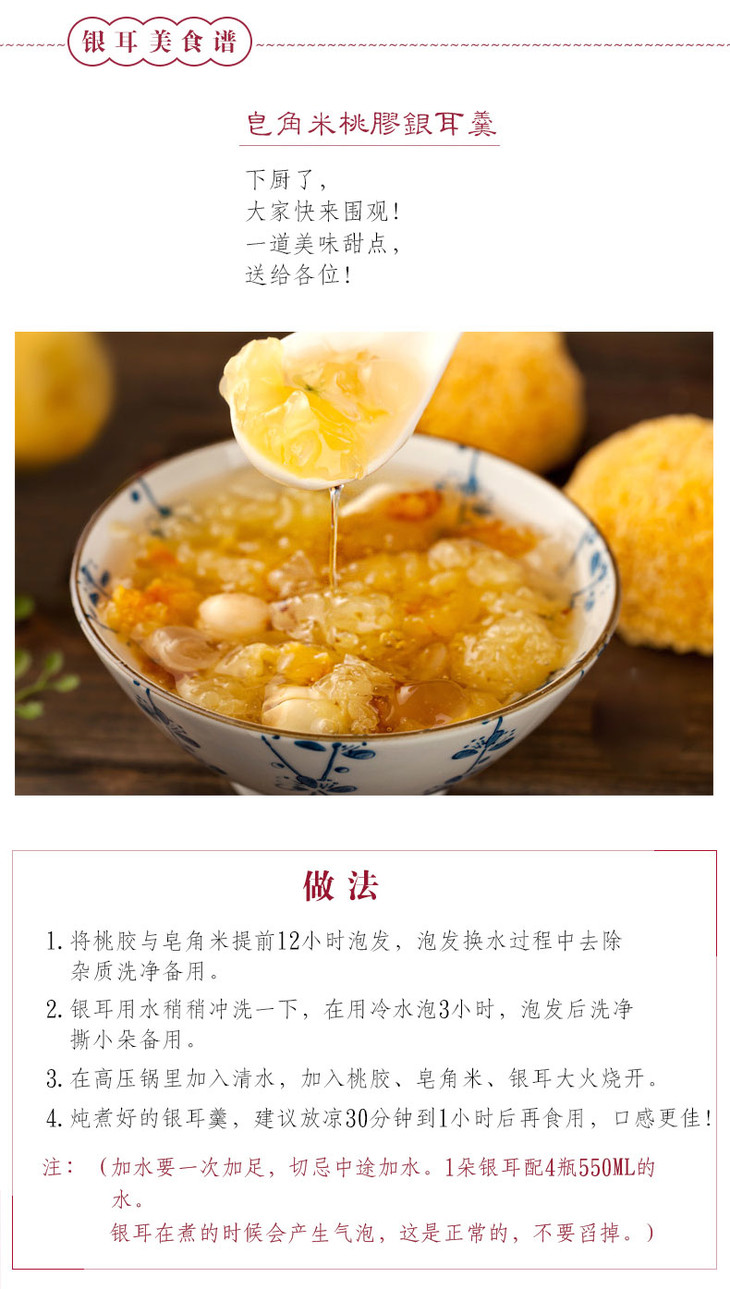特别注意事项:1、收到的银耳可能会有菌菇发酵的味道,属于正常情况,而非变质,这是因为银耳属于菌类,运输过程中发酵而引起的,您收到后将银耳放置在通风处两个小时,就会闻到银耳的清香,介意者勿拍,因为非质量原因,无法理赔;