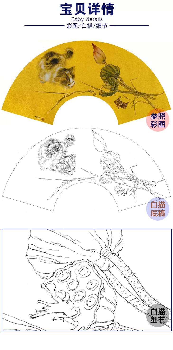 工笔花鸟动物白描底稿-米春茂-猫咪扇面小品-A355