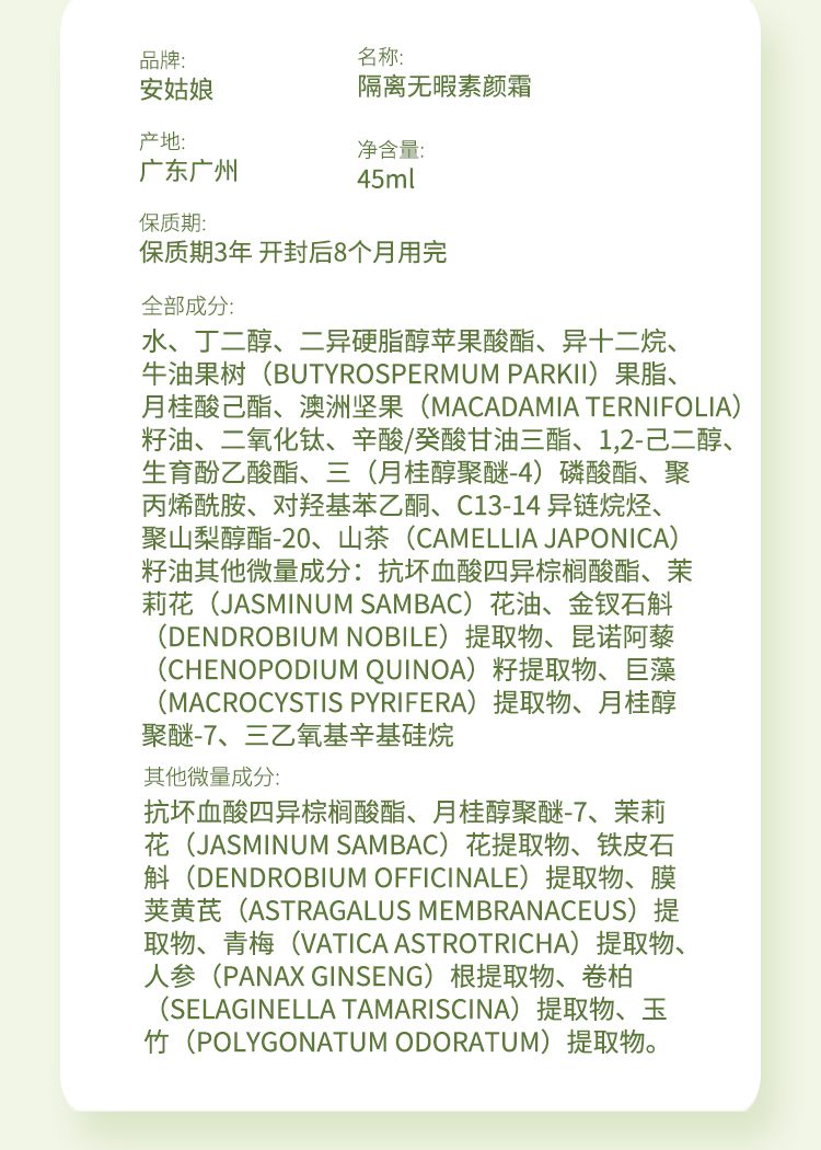 隔离无瑕素颜霜 | 45ml/瓶 自然不假白 轻遮瑕 提亮肤色 真空瓶包装 安姑娘(开封使用需要先按压30下左右)