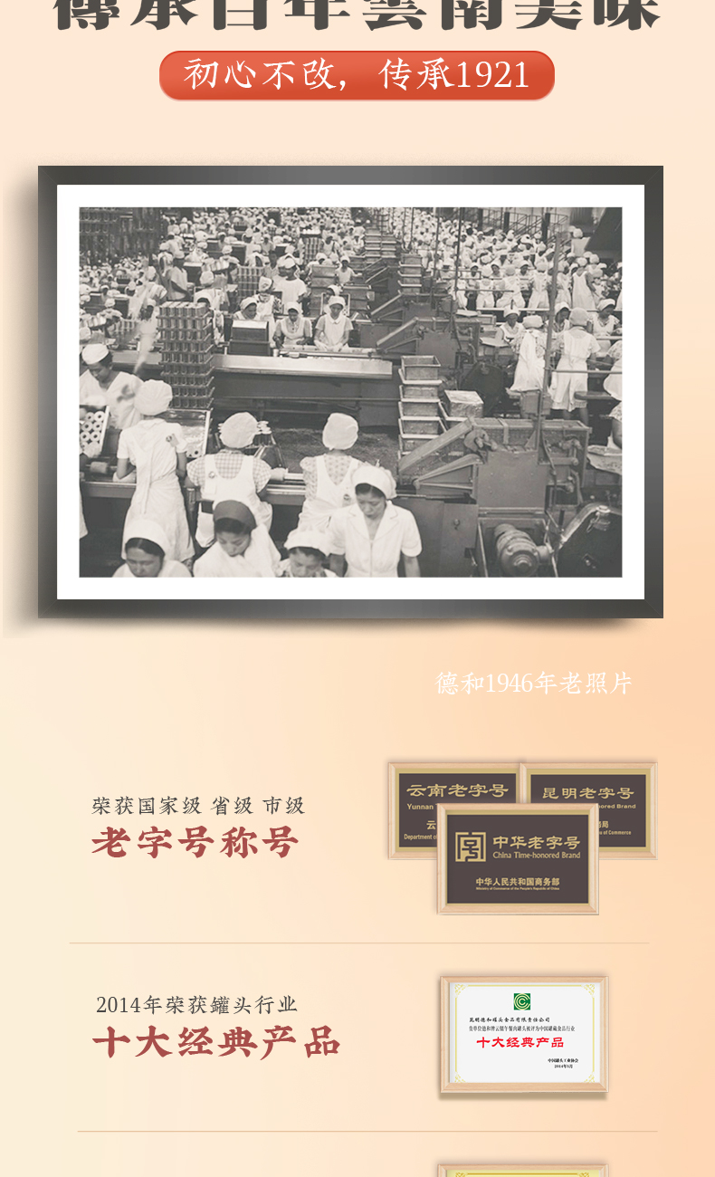 - 昆明德和罐头厂是中国最早开始生产制造罐头的企业之一,至今已有九十八年的悠久历史,现已形成以罐头食品为主,腌腊制品、糕点月饼等为辅的云南省规模最大和最具影响力综合食品制造企业,奠定了云南罐头行业的基石。