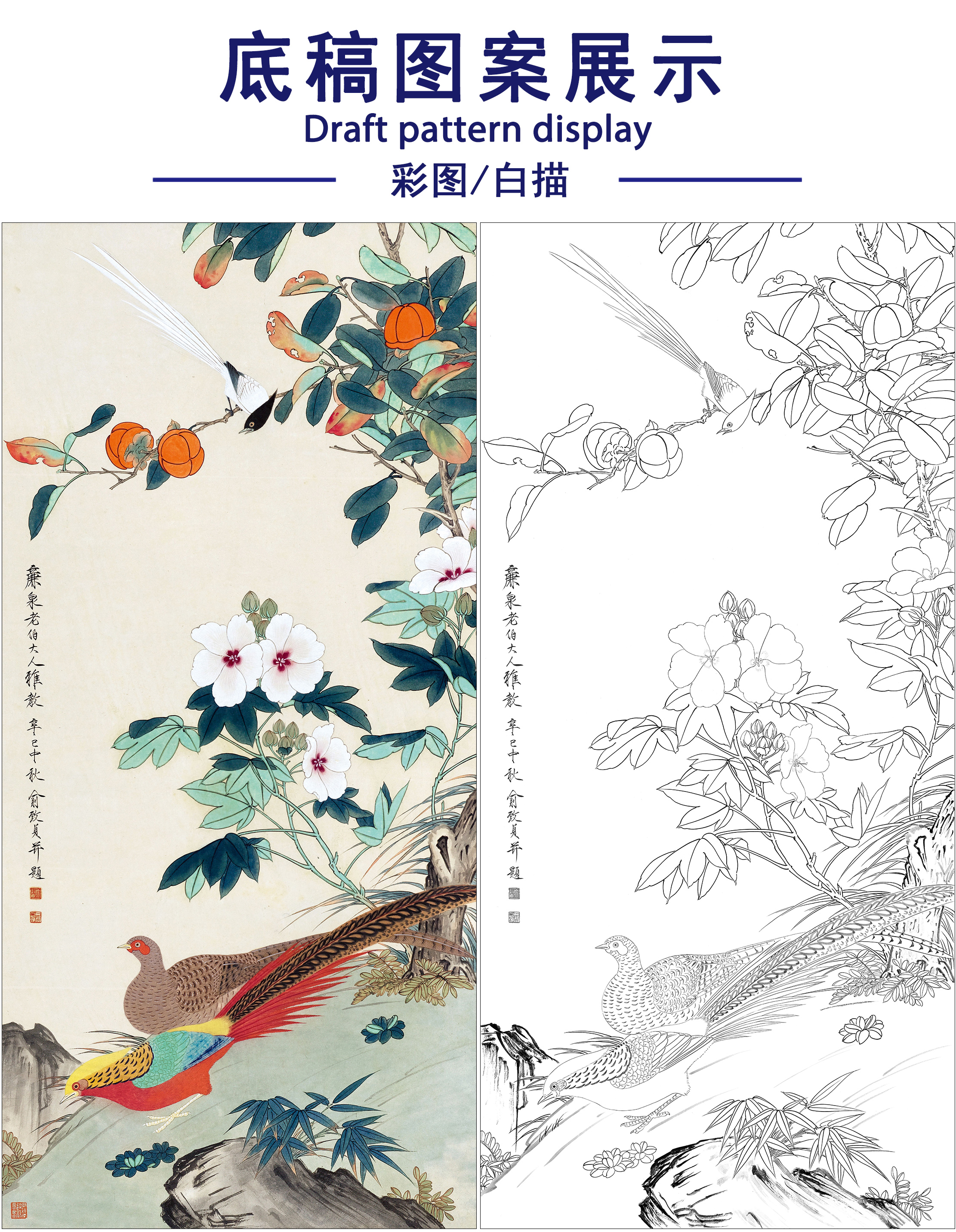 俞致贞花鸟工笔画白描底稿《繁花锦鸡》临摹勾线高清打印稿ZZ60