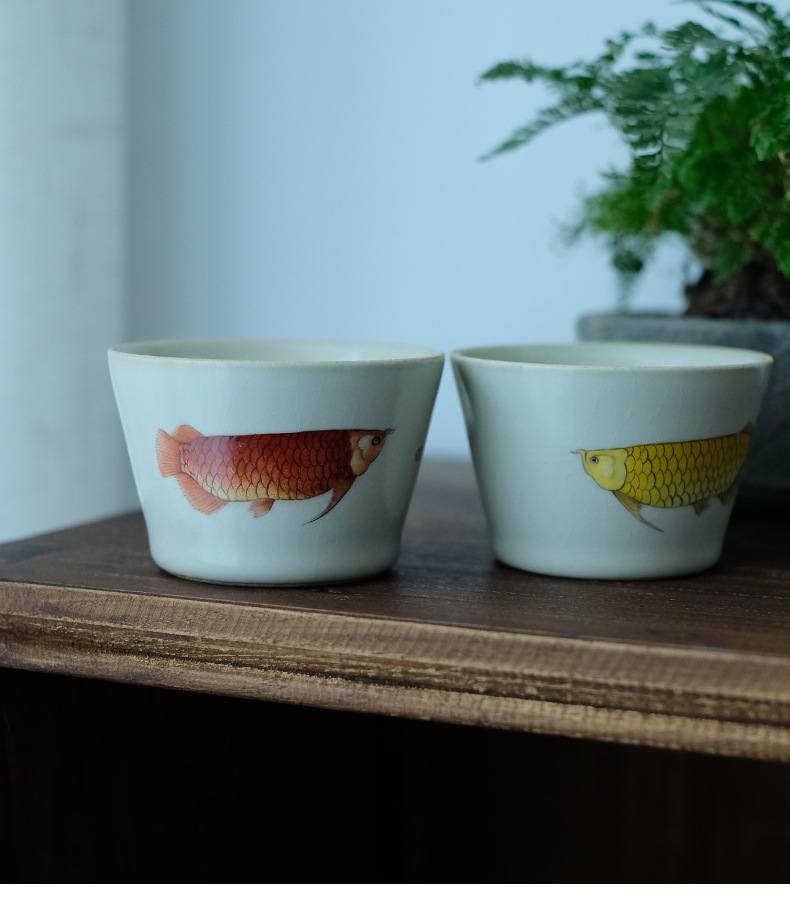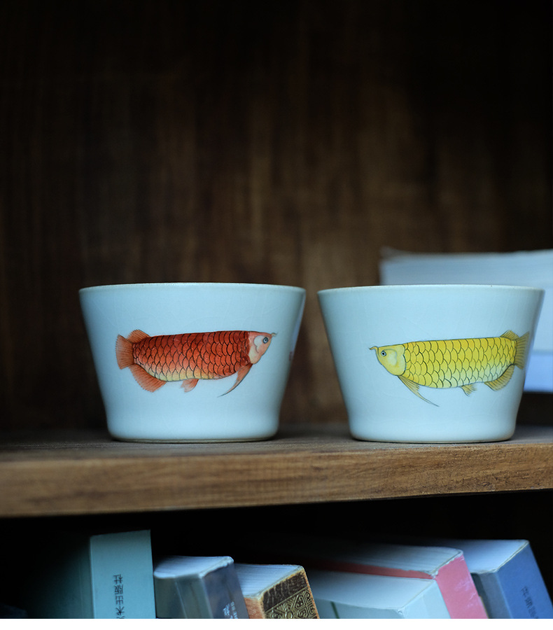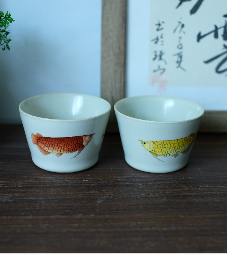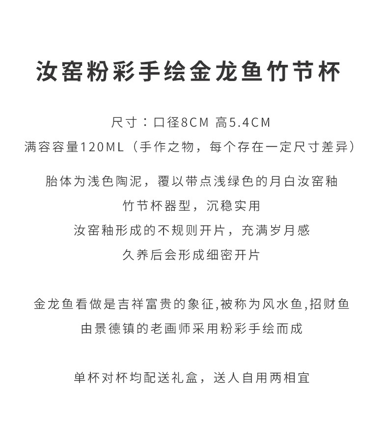 「景德镇汝窑手绘粉彩金龙鱼手工竹节杯」大号汝瓷开片主人杯 招财纳福