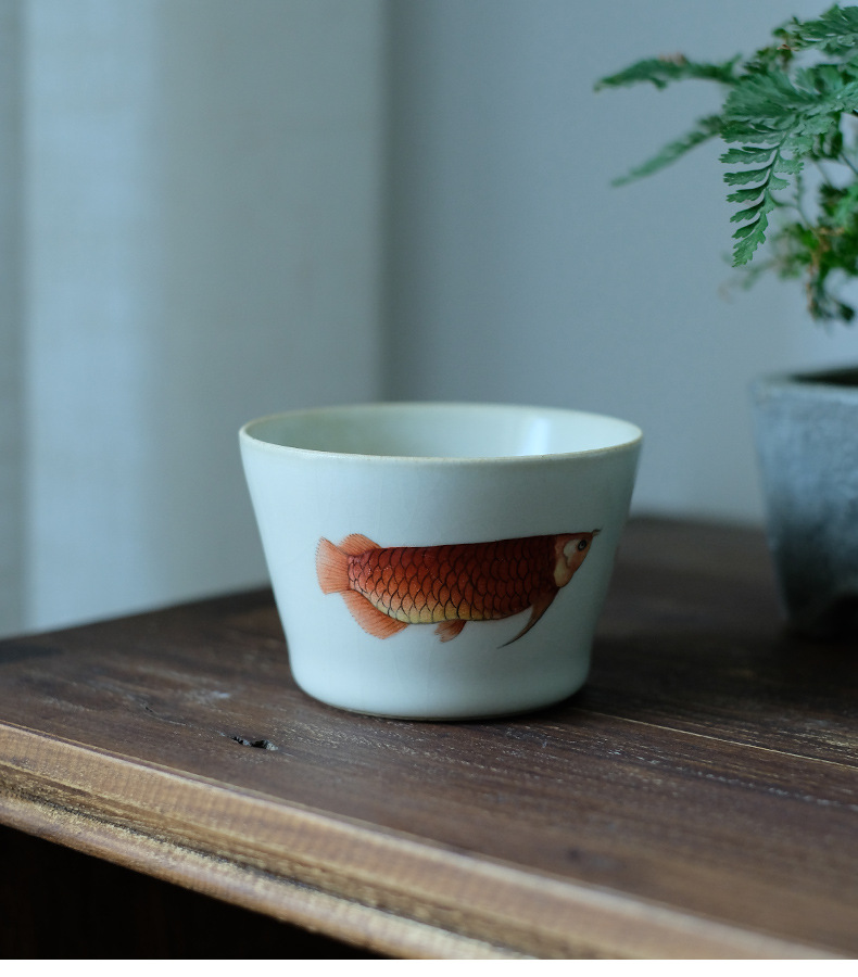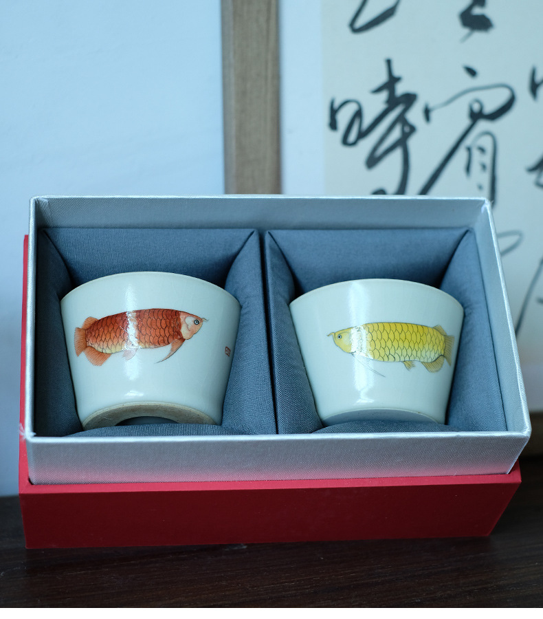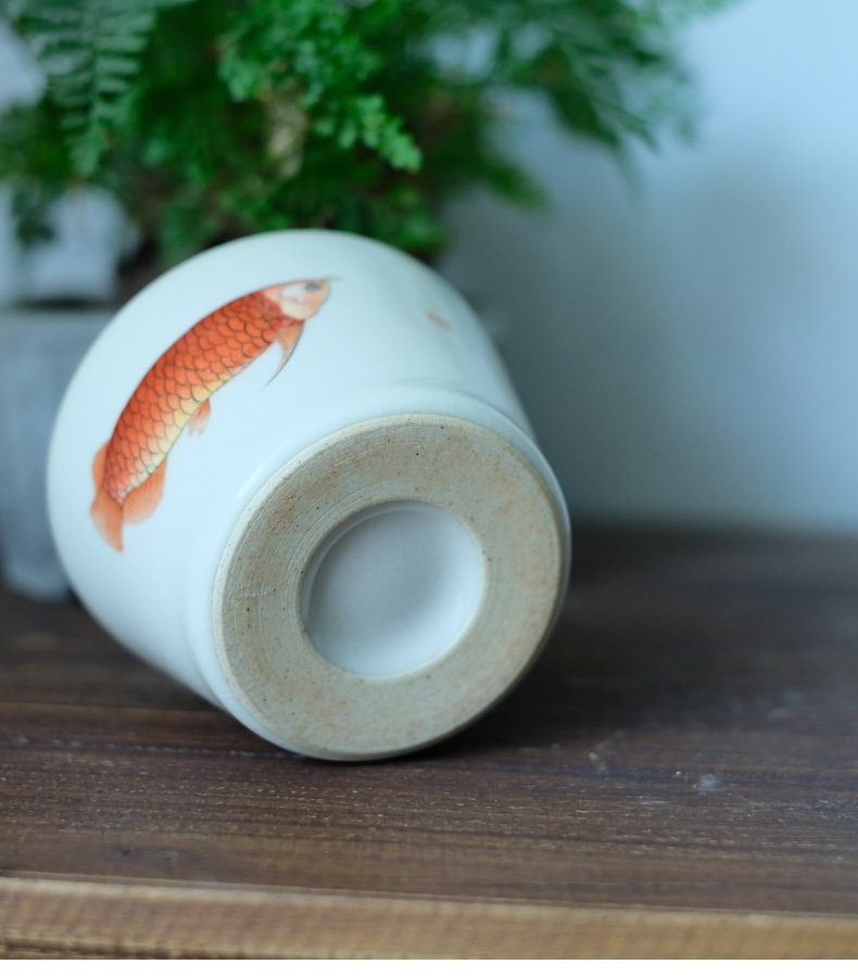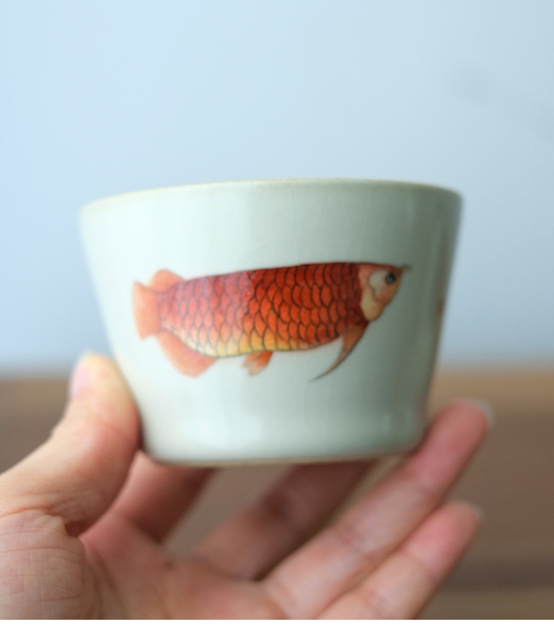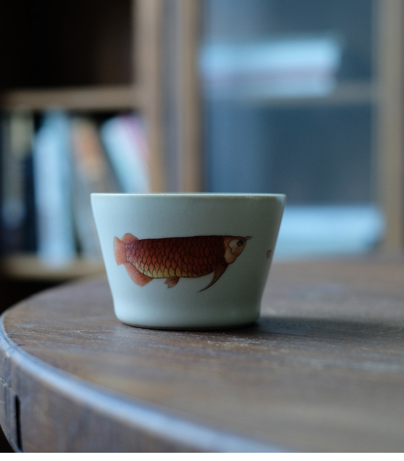「景德镇汝窑手绘粉彩金龙鱼手工竹节杯」大号汝瓷开片主人杯 招财纳福