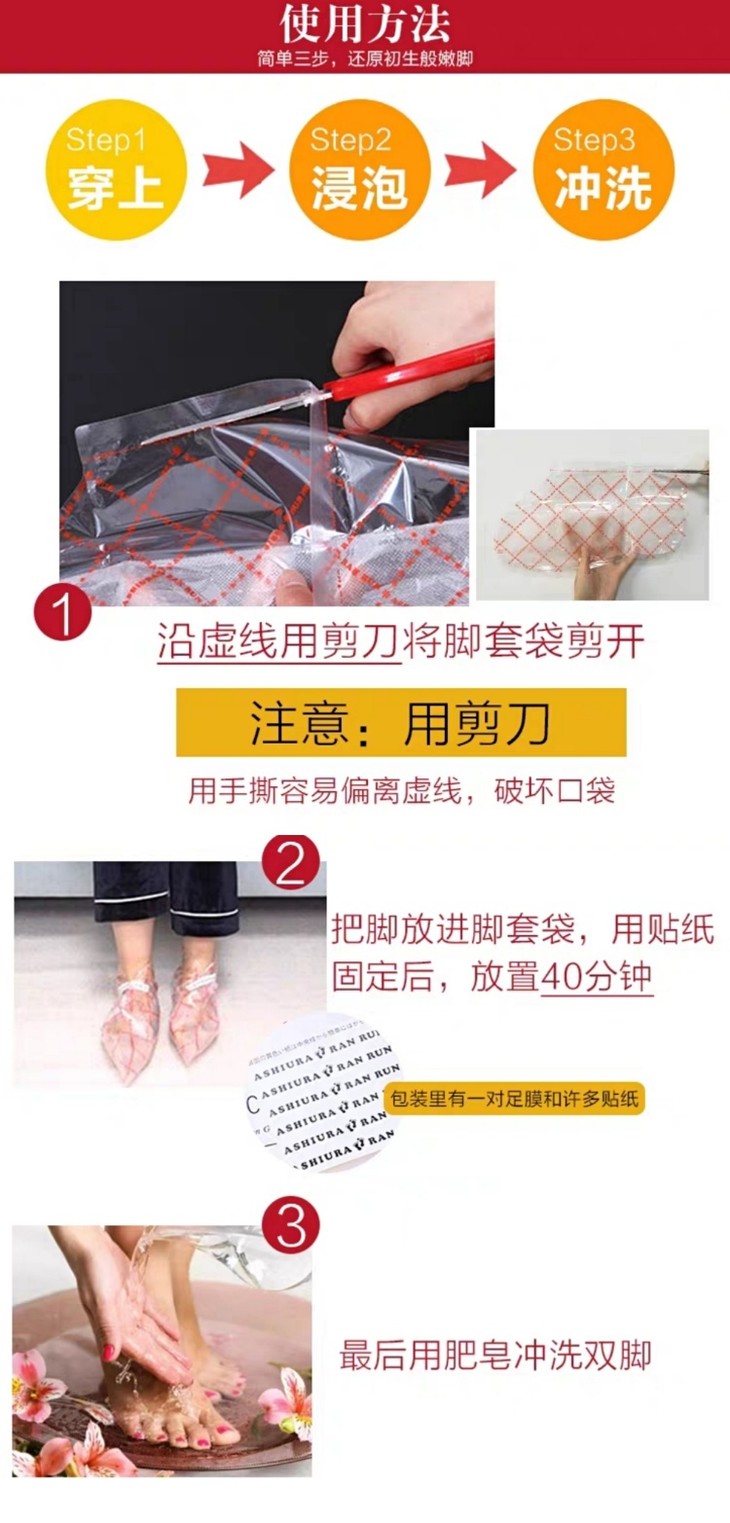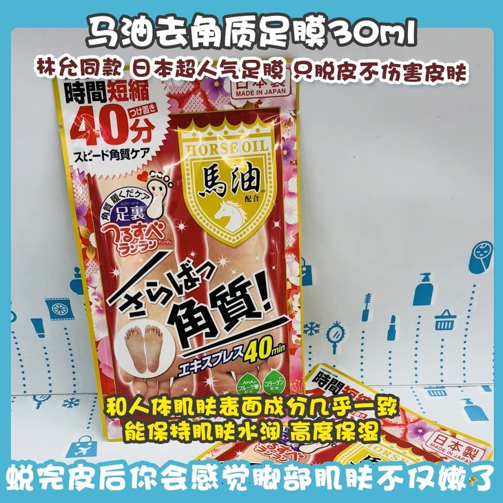 馬油去角質足膜30ml👍林允同款,日本超人气足膜,只脱皮不伤害皮肤。🐴含有马油成分,和人体肌肤表面成分几乎一致,能保持肌肤水润,高度保湿💧,快速渗透肌肤。刚敷上可能会觉得有点刺痛,不用担心这是正常的,🍃脚在足膜里呆40分钟左右后用沐浴露或香皂洗净,刚做完时不会掉皮的哟!👉接下来的三四天左右,就会开始有蜕皮现象。蜕完皮后你会感觉脚部肌肤不仅嫩了,☄还变光滑变白!!30ml*2枚(一双脚可用一次),两到三个月用一次即可,脚上有伤口的慎用❗