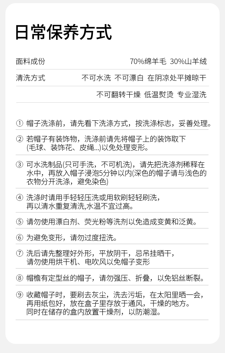 【其他注意事项】注意帽子的洗涤方式,每顶帽子都有吊牌