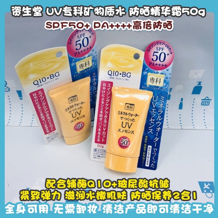 资生堂 UV专科矿物质水 防晒精华霜50g👍SPF50+ PA++++高倍防晒☀,配合辅酶Q10+玻尿酸💦,抗皱、紧致弹力、滋润水嫩肌肤,防晒保养2⃣合1⃣。取自富士山矿泉水基地的纯净矿泉水💧,富含矿物质,清爽不粘腻🍃,快速扩展延伸到皮肤层,促进美容液的吸收。无香料、无色素、无矿物油✅。全身可用,无需卸妆,清洁产品即可清洁干净~