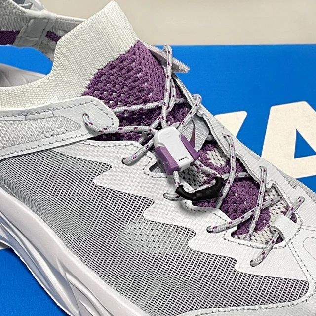 鞋身抽拉式快速系带系统 可根据脚型轻松调节松紧 牢固锁定双足!胖脚瘦脚都能穿 放心入哈!