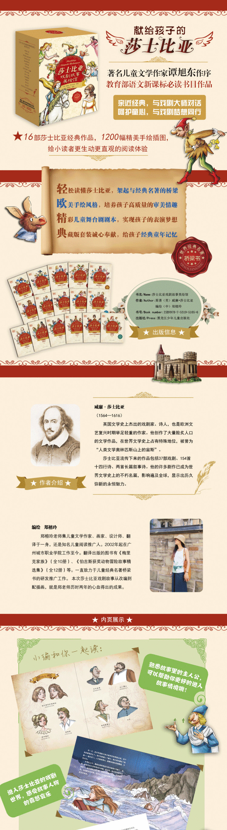 作为文坛的一代大师,莎翁的作品影响了一代又一代人。黑龙江少年儿童出版社最新推出的《莎士比亚戏剧故事美绘馆》系列不仅是纪念莎翁的一次献礼,同时也是送给孩子们的一份最珍贵最美好的礼物。