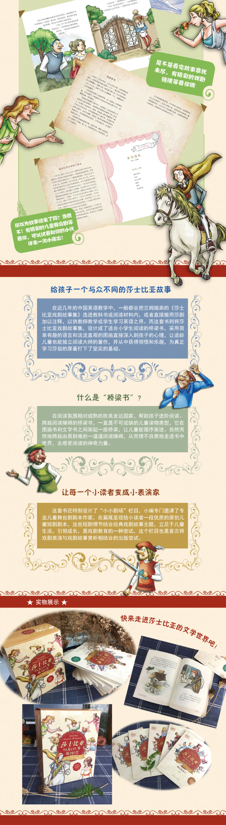 轻松读懂莎士比亚,为孩子架起与经典名著的桥梁; 手绘欧美绘画风格,培养孩子高质量的审美情趣;精彩“小小剧场”栏目,感受儿童舞台剧的魅力,让每一个孩子都实现表演梦想;典藏版套装诚心奉献,留给孩子经典童年记忆!