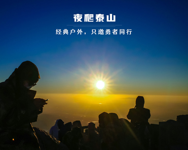 5)适合集合出发直奔泰山,到达【泰山】脚下,准备装备,建议大家购买小手电、手套、矿泉水、面包、泡面、巧克力等等,大家也可以在这吃晚饭。我们可乘坐景区小巴直接到中天门(费用自理),然后再步行通过泰山著名的十八盘,登顶南天门!预计5-6小时左右,我们就可以全员登顶。之后就在山顶静静的等待日出,大家可以看好时间(大概四点多可以去占机位),提前去“山尖儿”上抢拍摄的好机位!