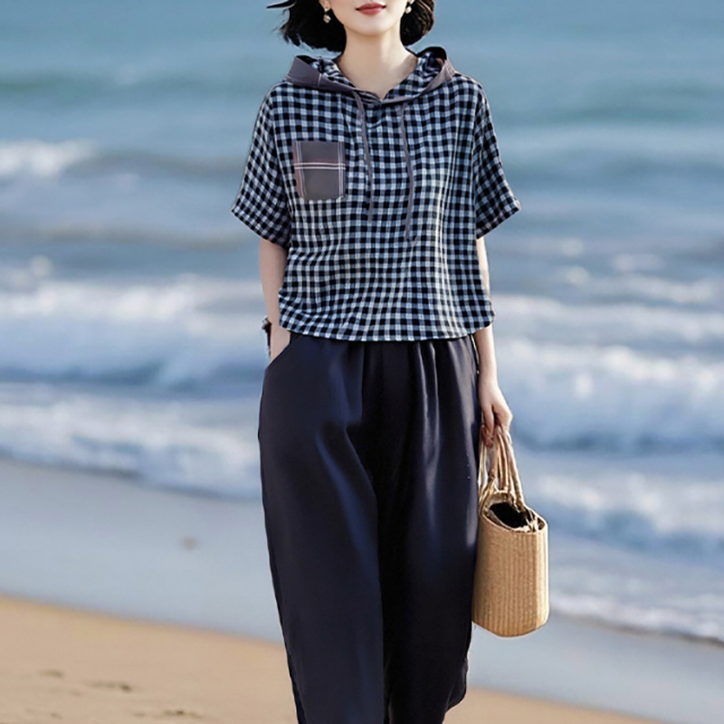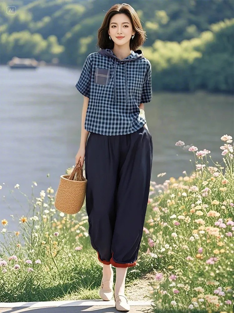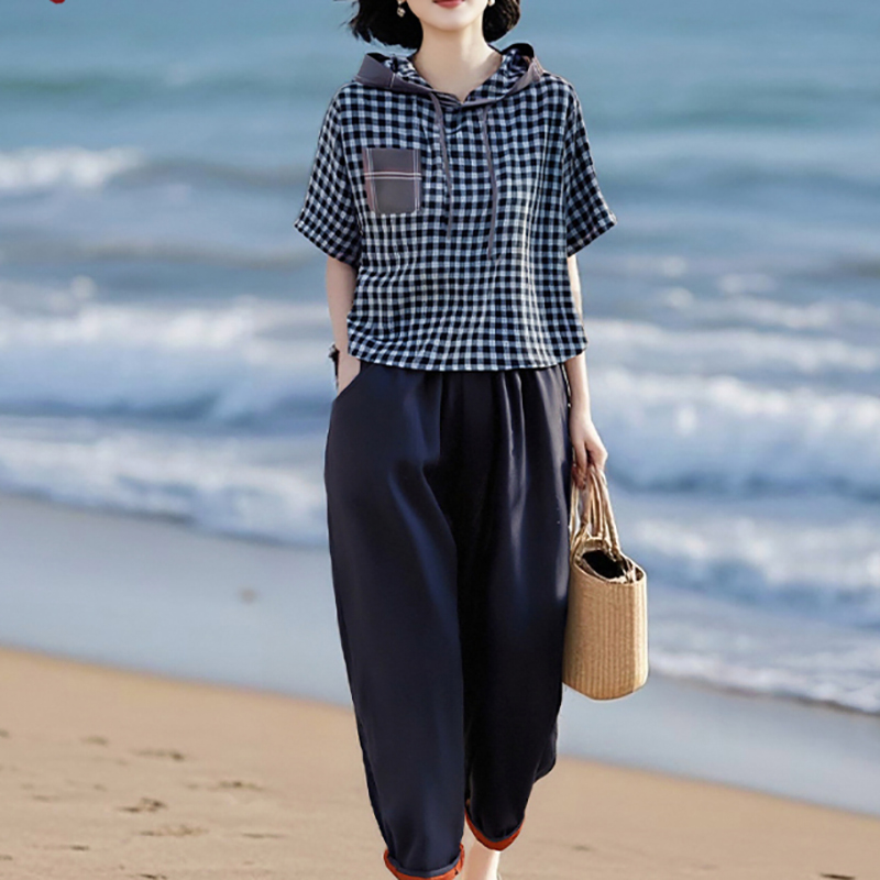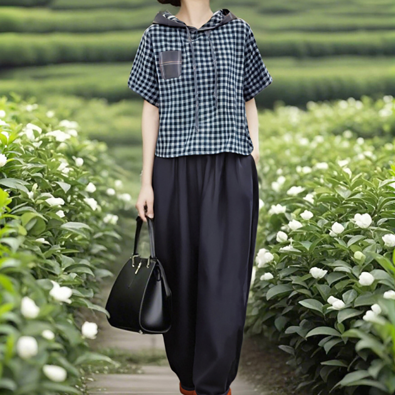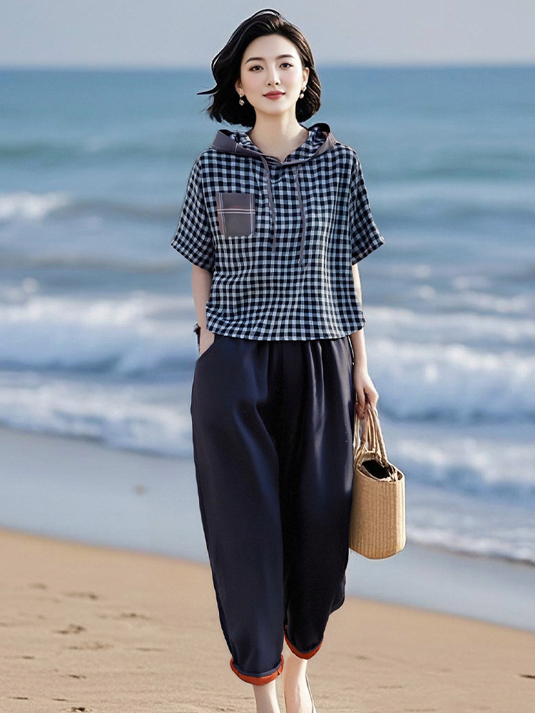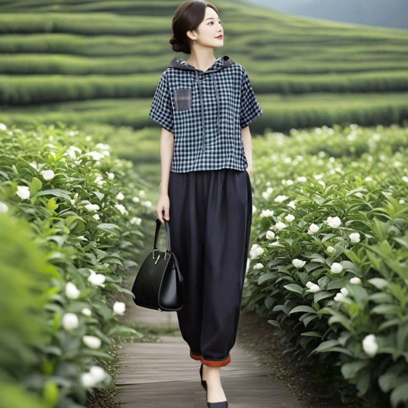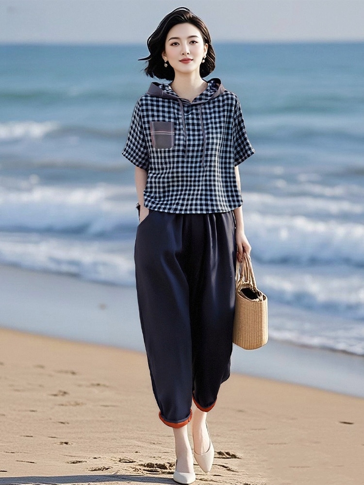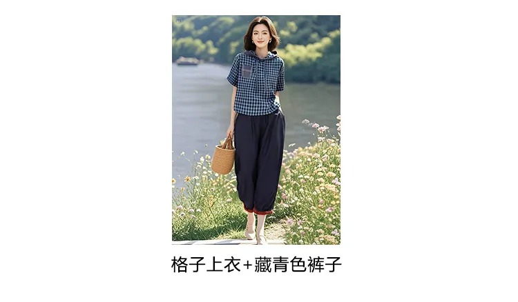 棉质格子上衣+松紧腰天丝棉萝卜裤两件套装LJX-058