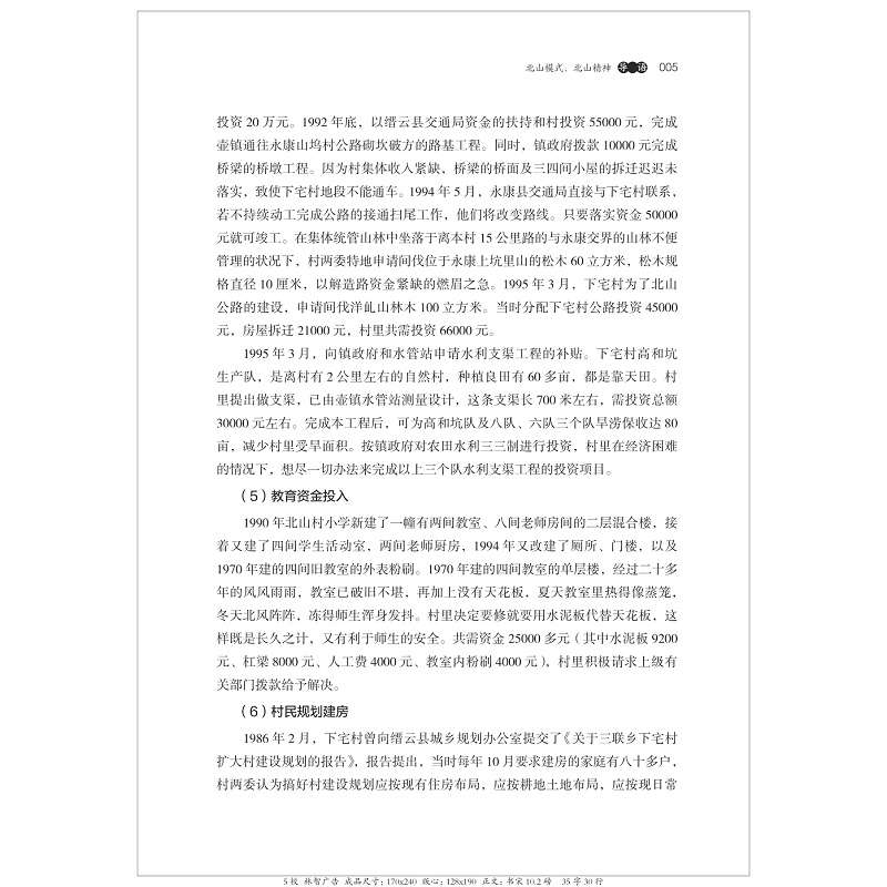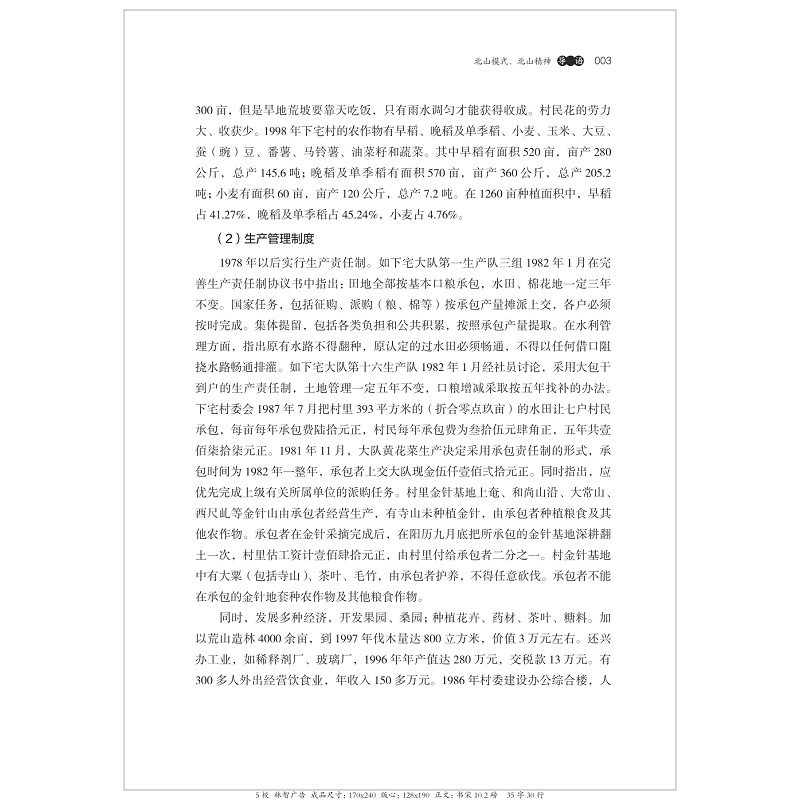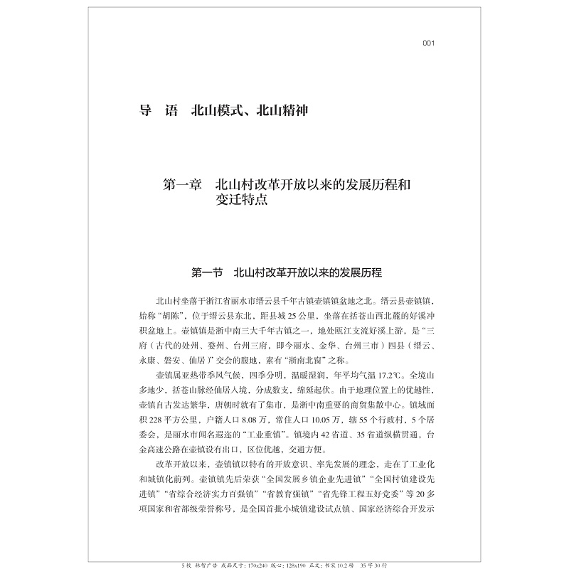 本书系“中国村庄发展的浙江样本研究丛书”之一。是《丽水市缙云县北山村发展研究》课题的最终成果。本书主要围绕北山模式的形成、北山模式的特点和北山模式可复制的经验及其借鉴意义进行了分析。本书分为《导 论:北山模式与北山精神》、《史地篇:眠牛金星与文化古村》、《经济篇:农业经济与电商经济》、《社会篇:美丽乡村与和谐环境》、《生活篇:美食节庆与生活习俗》《文化篇:底蕴深厚与精神家园》《专题篇》、《口述访谈篇》、和《文献篇》共九篇。