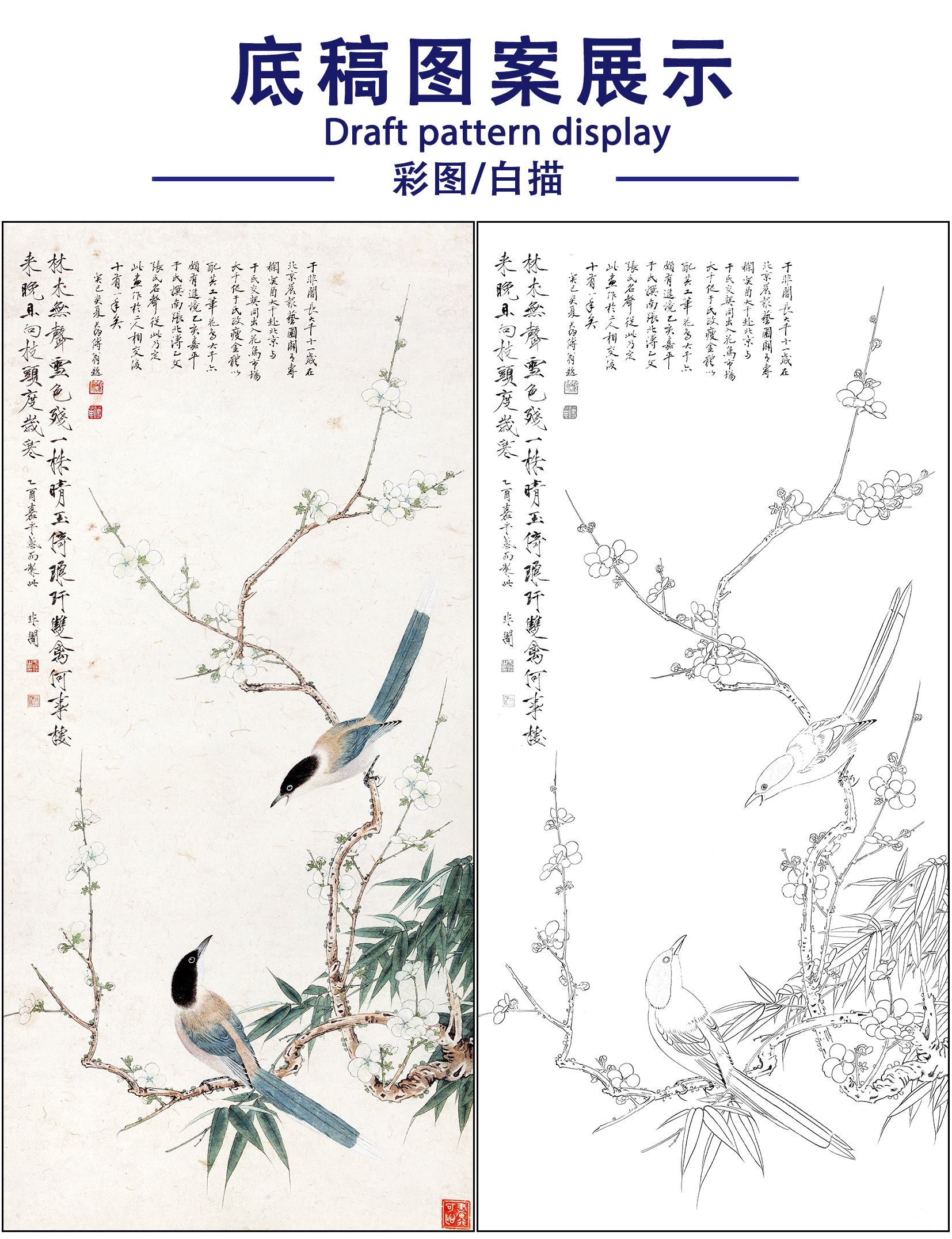 工笔画白描底稿于非闇花鸟《喜上眉梢》临摹勾线高清打印稿FA32