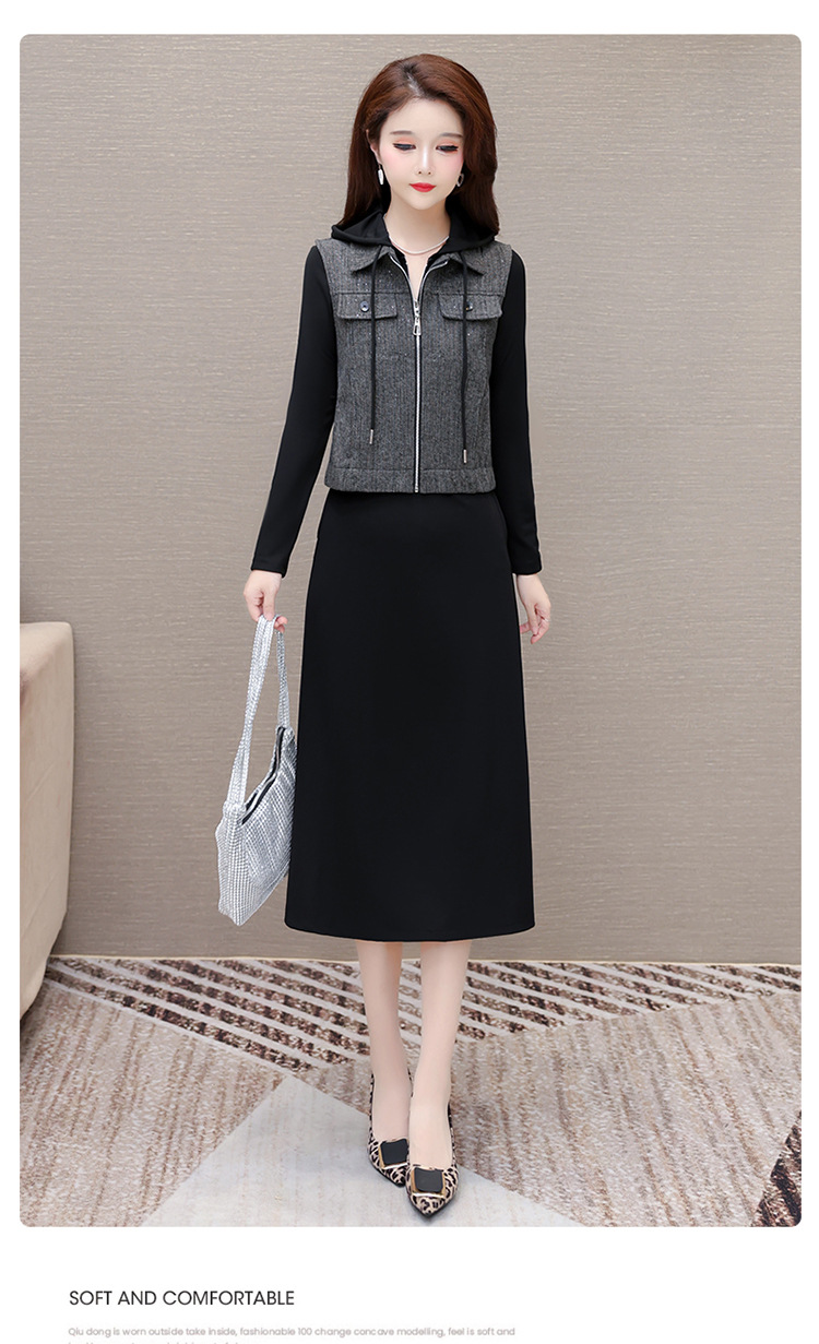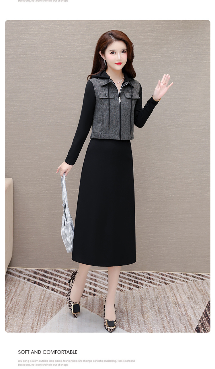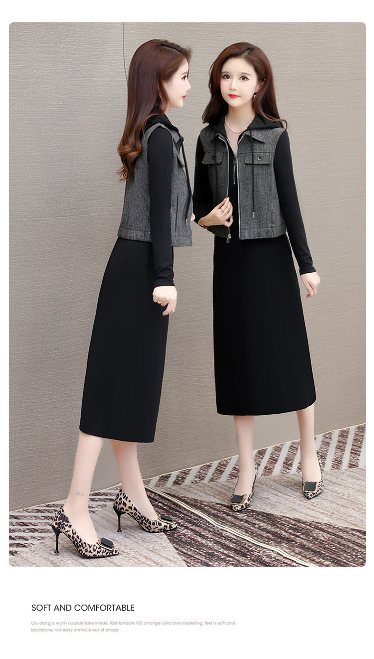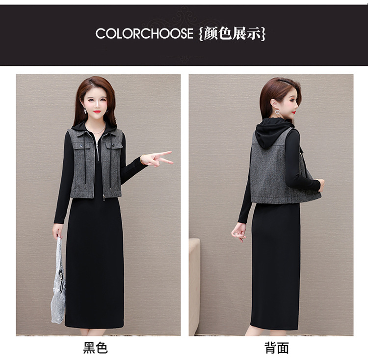 QYM F183-Y时尚连帽马甲连衣裙两件套休闲套装裙 商品图1