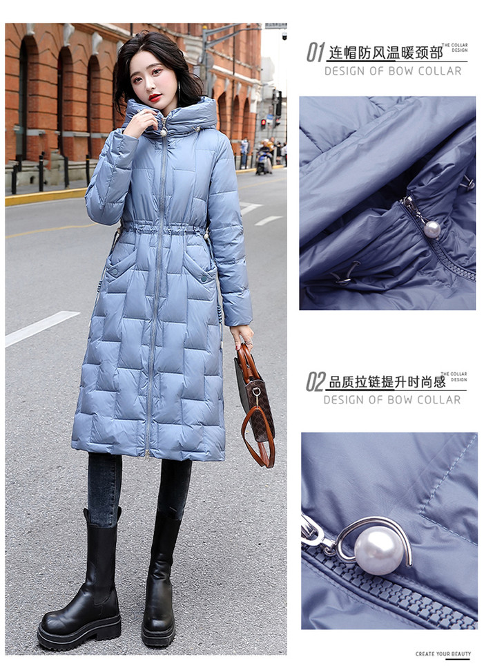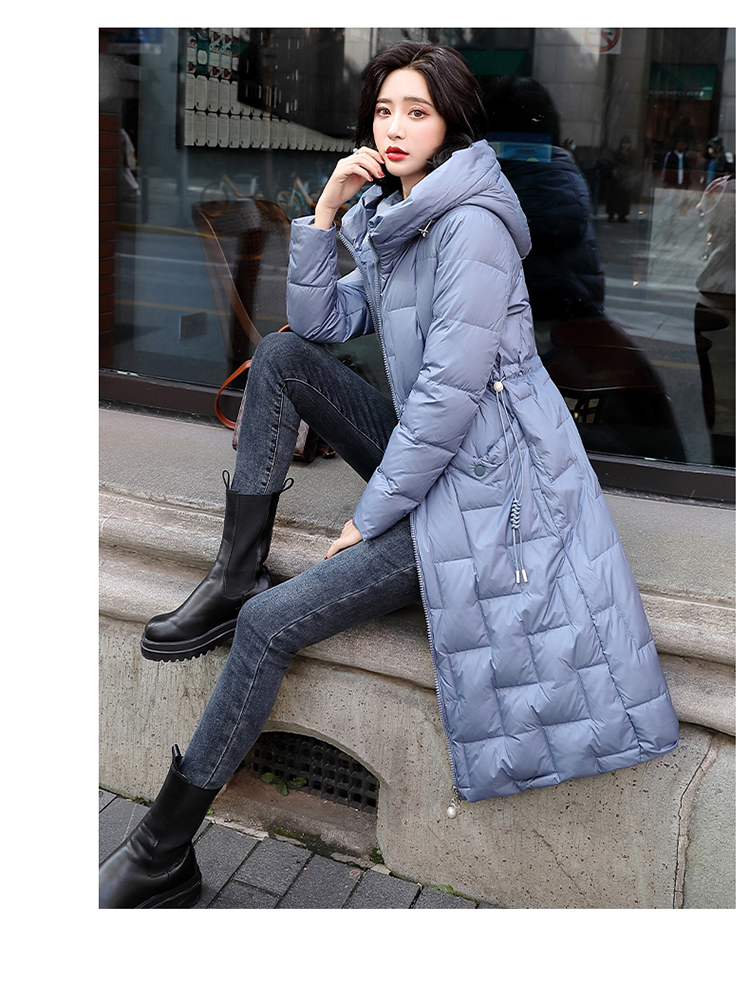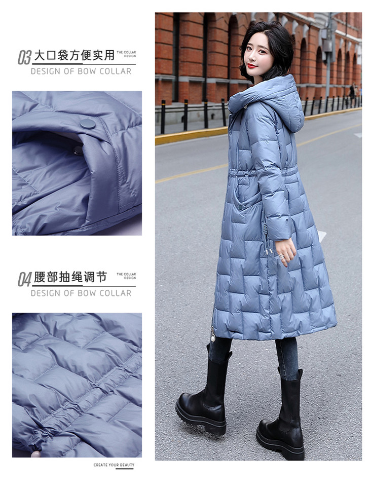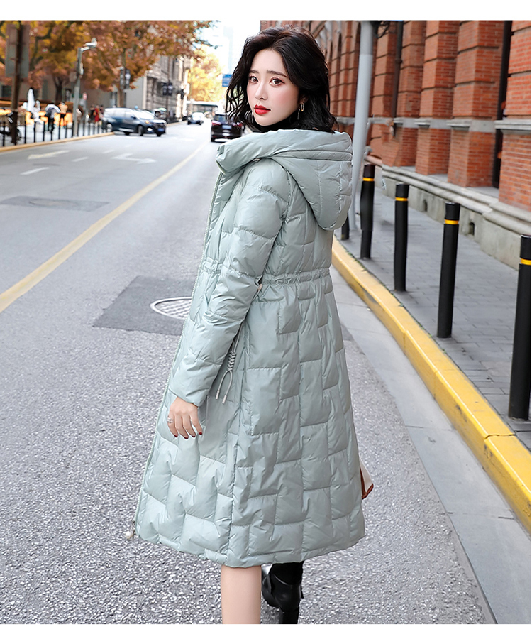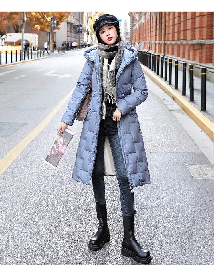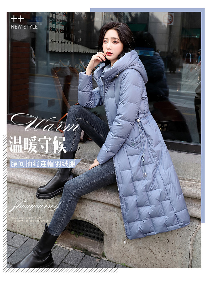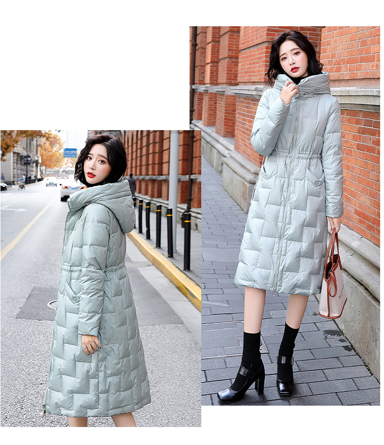 CPYY9058-1 羽绒服新款2021年女装工艺走线腰间抽绳修身连帽长款90白鸭绒