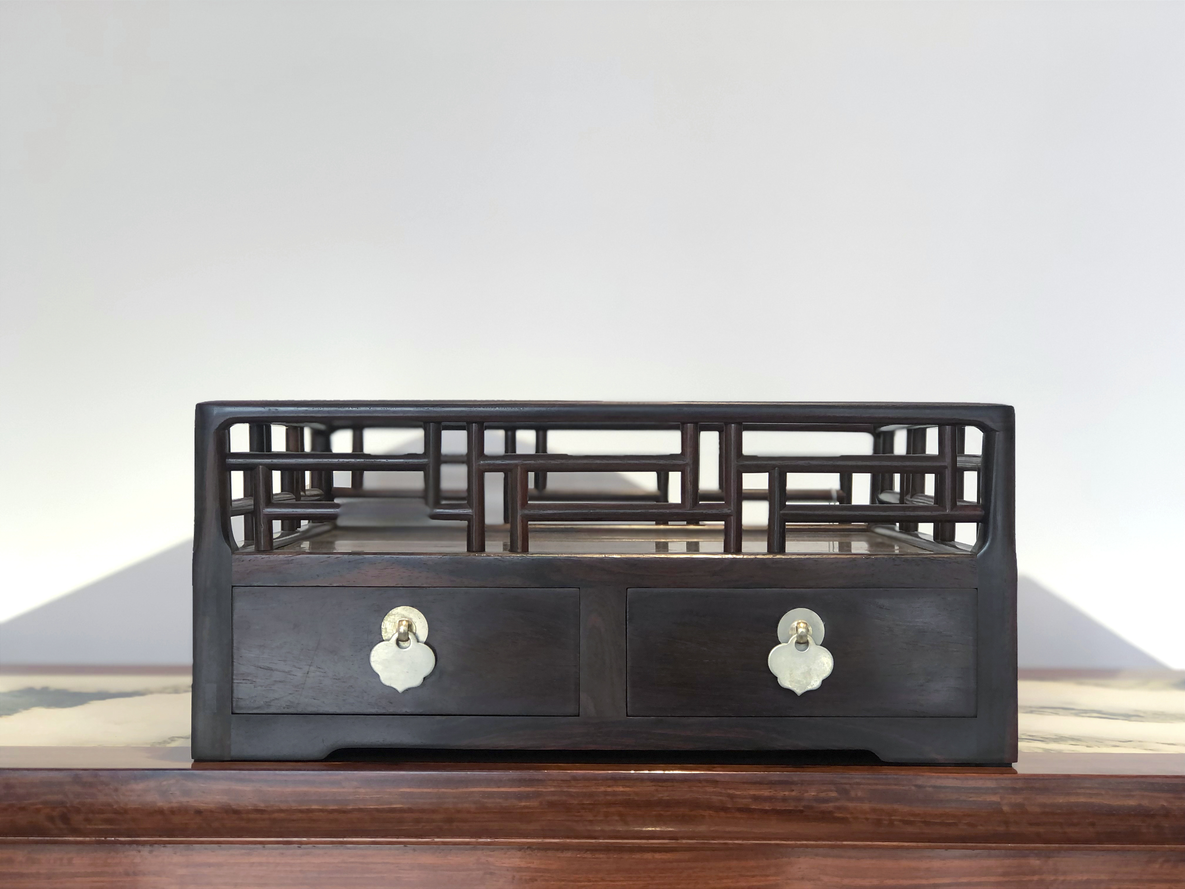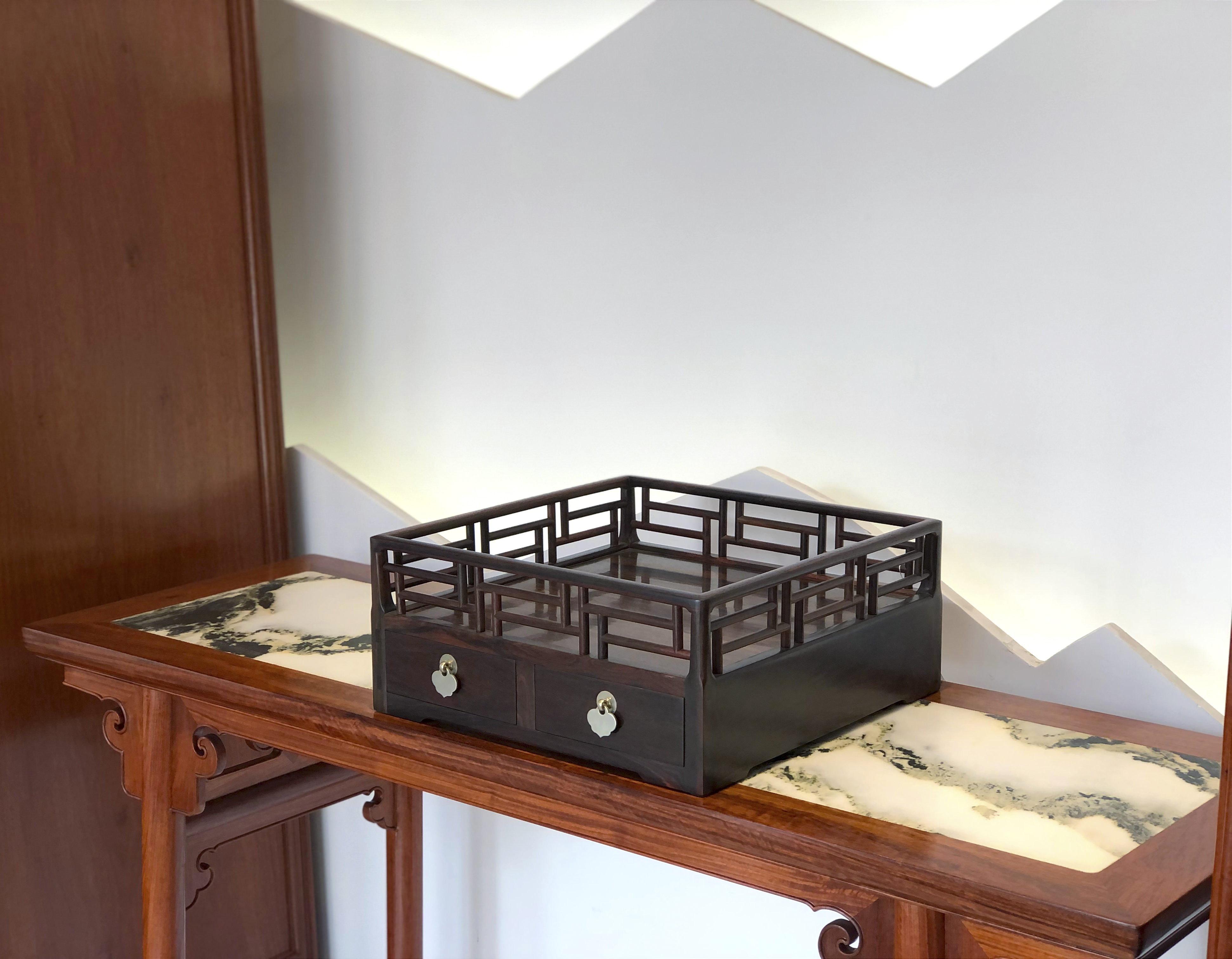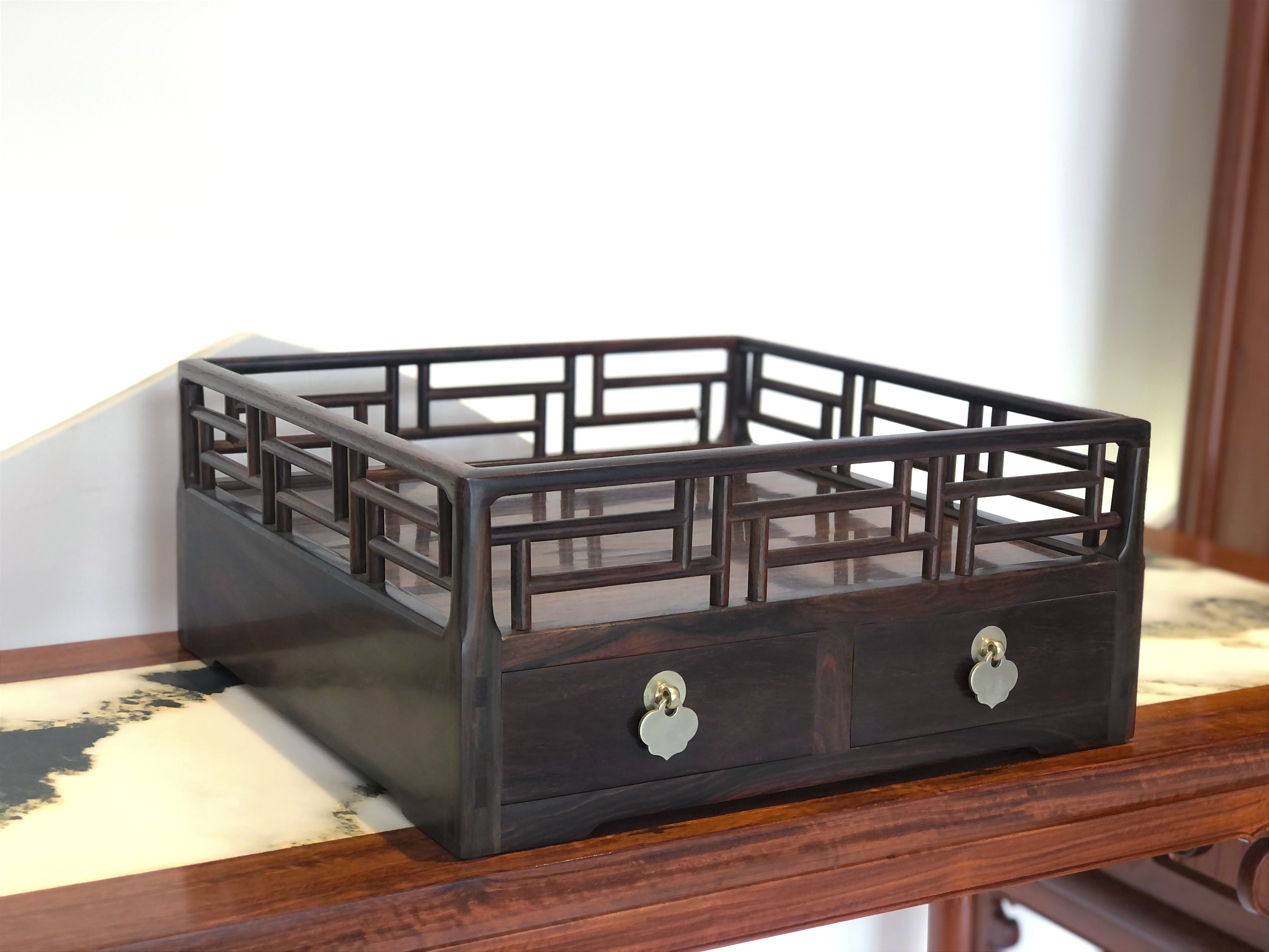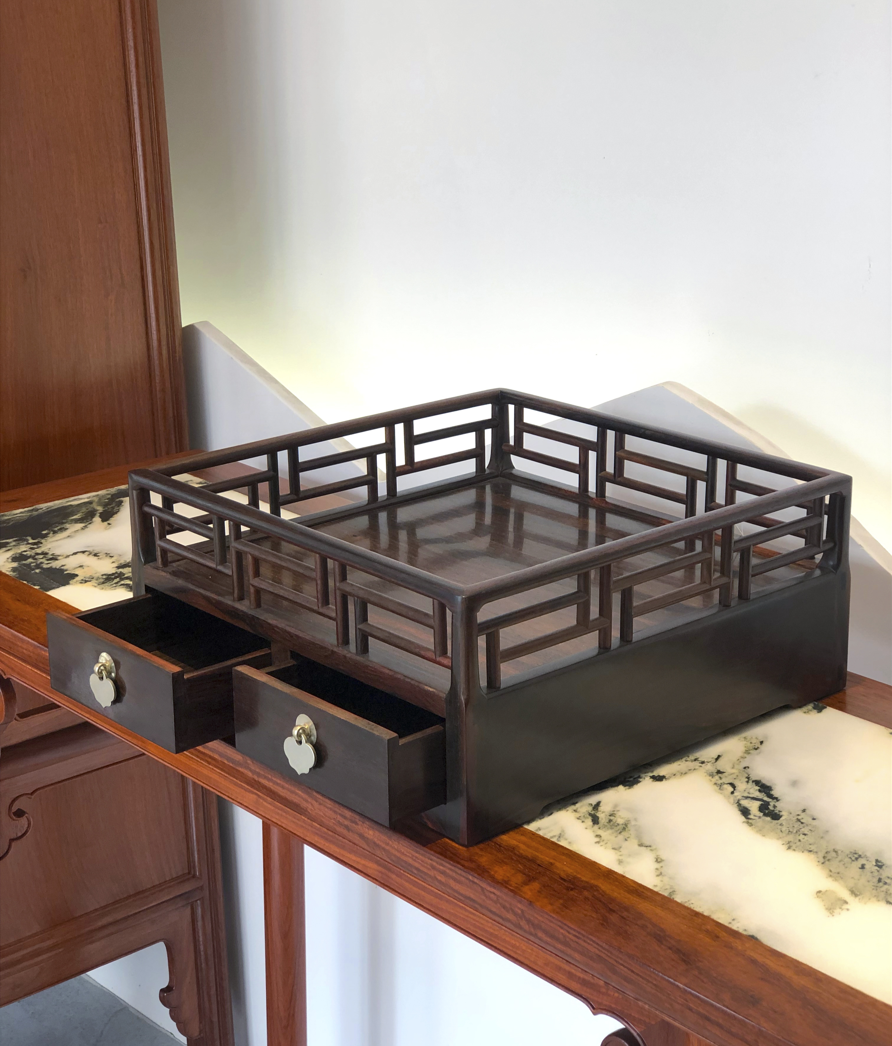 王世襄先生,书房中有一件鸡翅木都承盘后藏于上海博物馆,收录于《明式家具研究》戊26,此器为典型明式风格,呈方形四面井字棂格,亦称“风车式”,棂格圆木做飘肩丁字结合,尤为吃工,其结构为四根栏杆望底直通,形成角柱,三面盘墙用整版,板端出榫,和角柱透榫相交,与常见的攒框打槽装板方式不同,此大红酸枝复刻款,屉亦用厚独板,器小弥珍之态度,沉甸压手,从传世情况看,都承盘在清代比明代更为流行,故此复刻款殊为难得,至于案头,更添风雅。