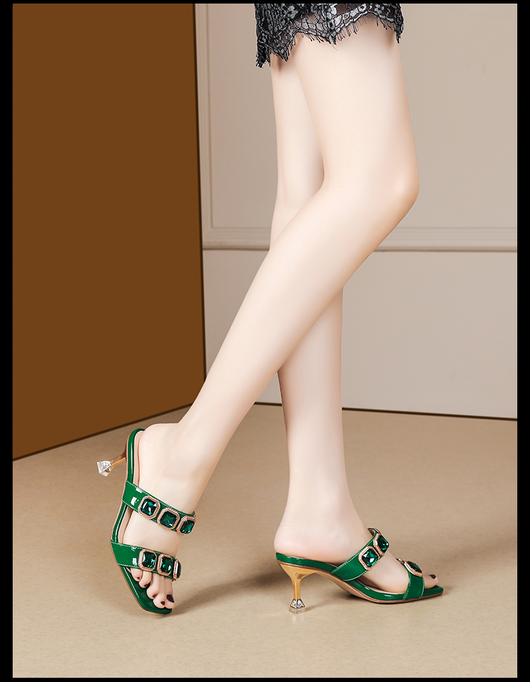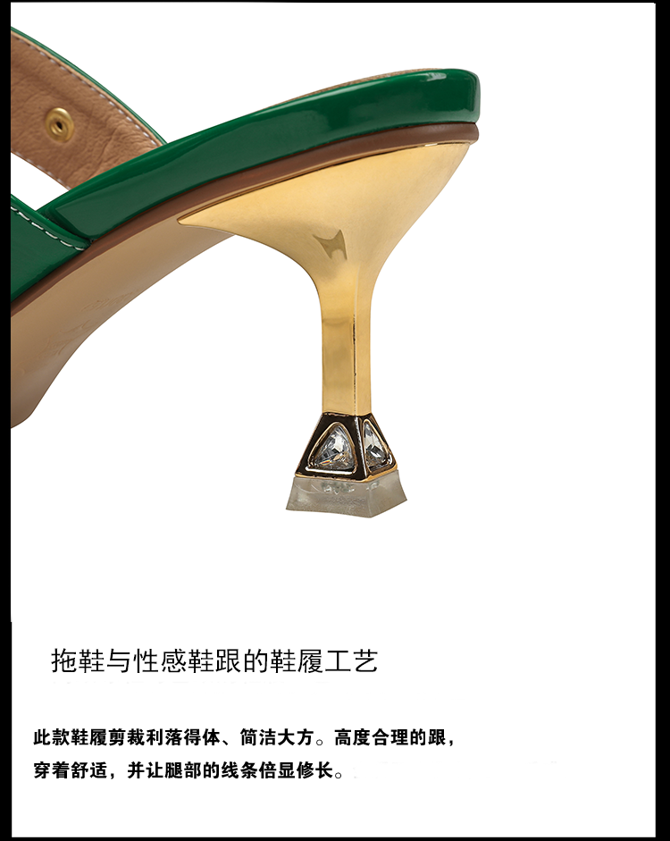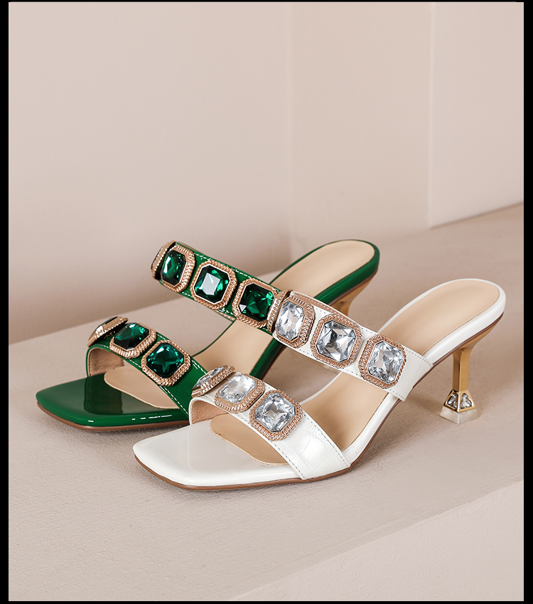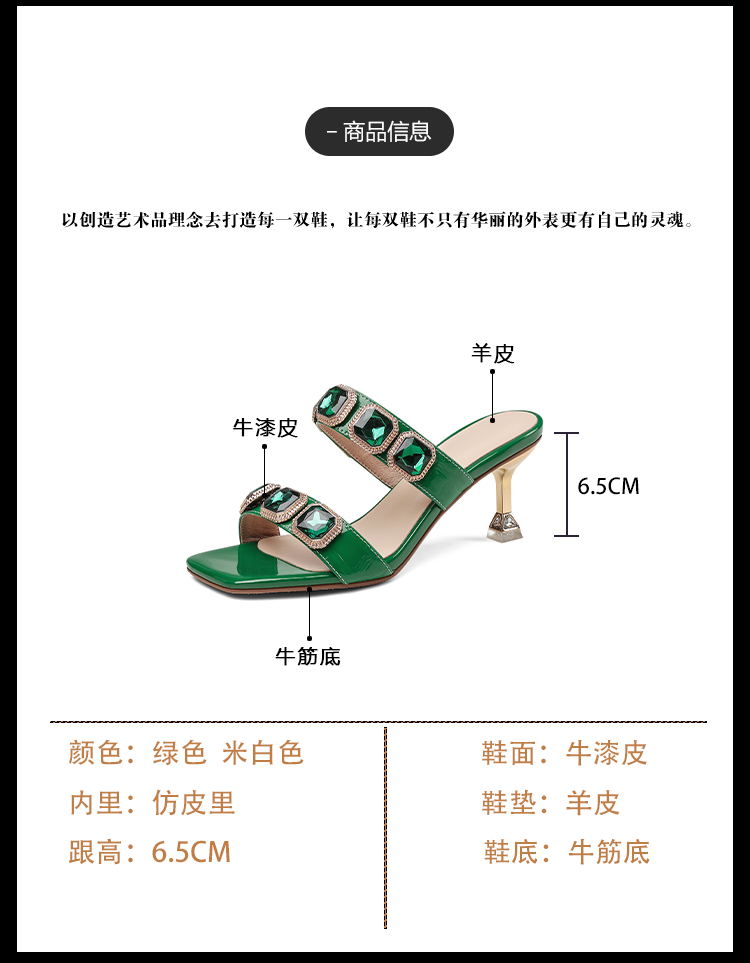 新款外穿,高跟细跟白色绿色皮拖真皮水钻韩版凉拖鞋PLGZ-D109-1