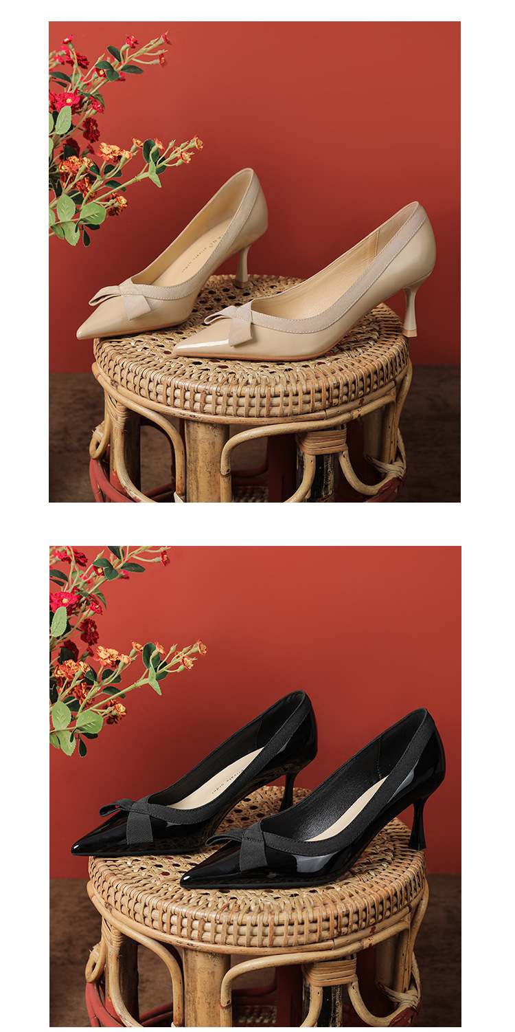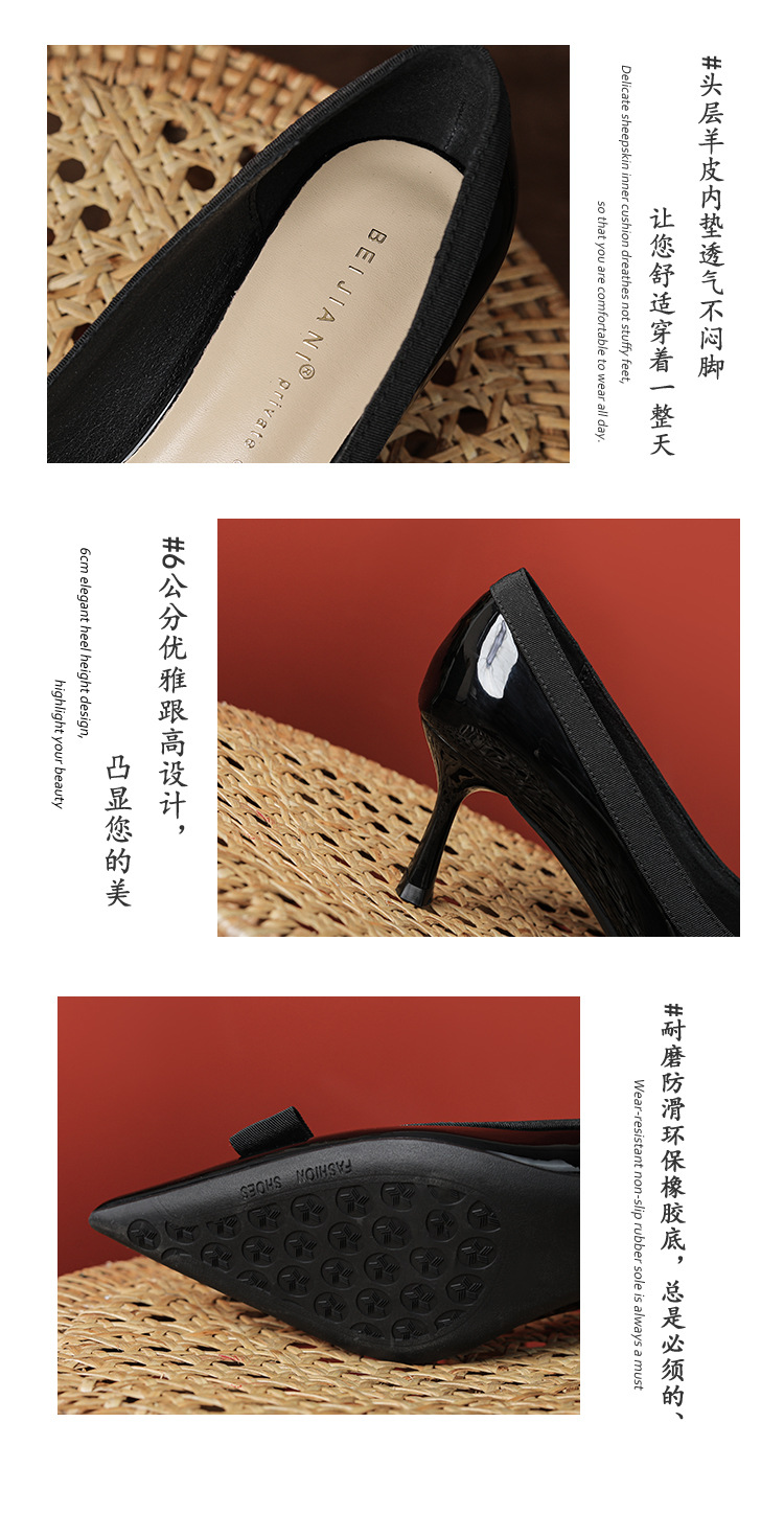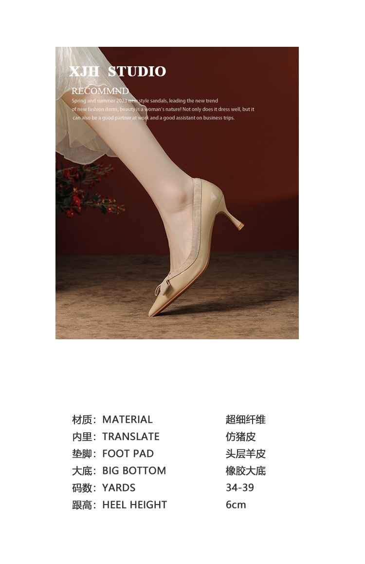 TZW-3356-19 羊皮法式高跟鞋女细跟尖头单鞋通勤蝴蝶结气质不累脚浅口
