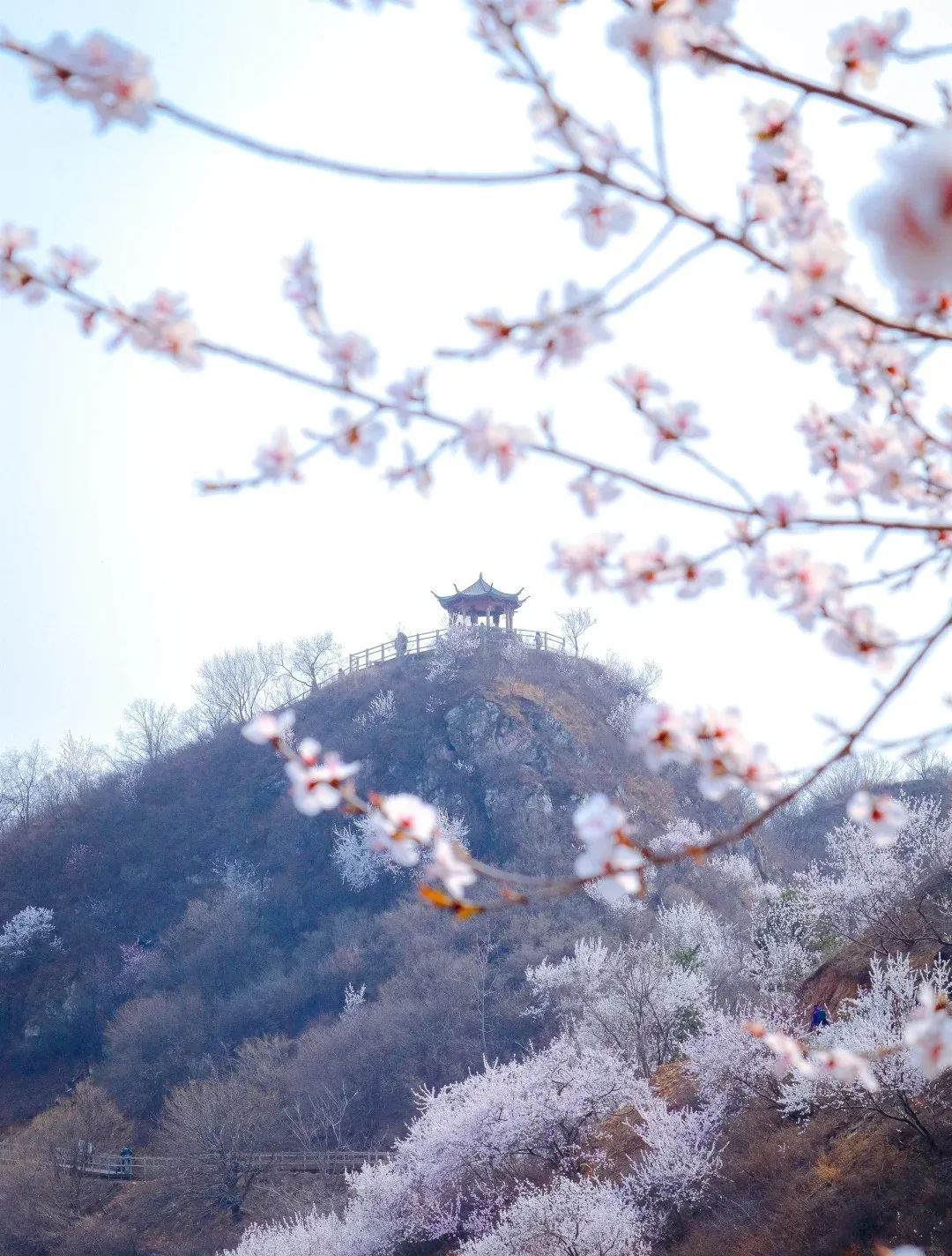 望宝川至东水峪环线,是一条贯穿燕山腹地原始峡谷的十公里徒步路线。线路以北京市昌平区望宝川村为起点,途经明代古长城遗迹、野生桃花谷、丹霞地貌区,最终抵达东水峪古村落遗址并折返,形成一条海拔攀升约四百米的环线。抵达首个观景台,可俯瞰山谷初现的粉色花海。路径沿溪涧蜿蜒,两侧丹霞地貌赤壁耸立,与野生桃林形成强烈色彩对比。春季两侧山桃、山杏夹道,三月初至四月初为最佳花期。