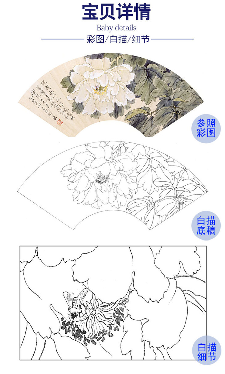 于非闇工笔花鸟白描底稿-扇面小品牡丹蜜蜂-YF63