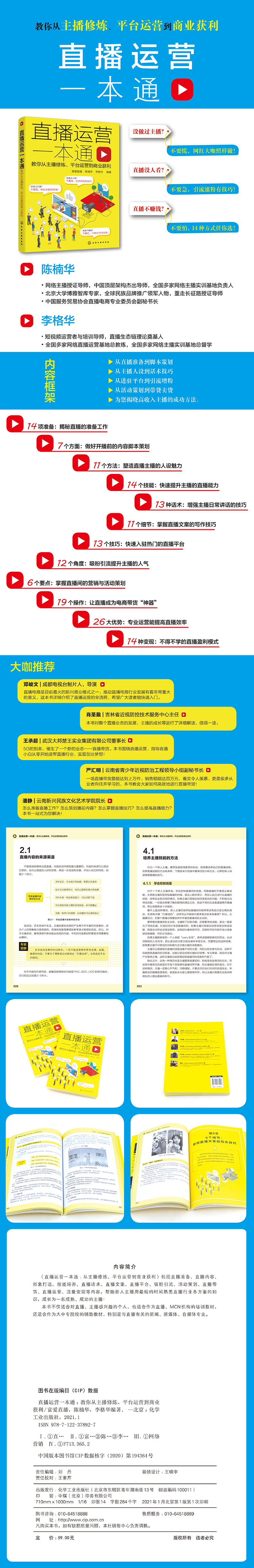 《直播运营一本通:从主播修炼、平台运营到商业获利》包括直播准备、直播内容、形象打造、技能培养、直播话术、直播文案、直播平台、吸粉引流、活动策划、直播带货、直播运营、流量变现等内容,帮助新人主播用zui短的时间熟悉直播行业各方面的知识,成长为一名成熟、成功的主播!