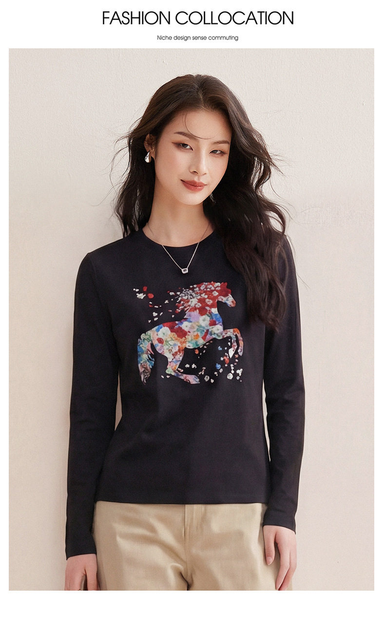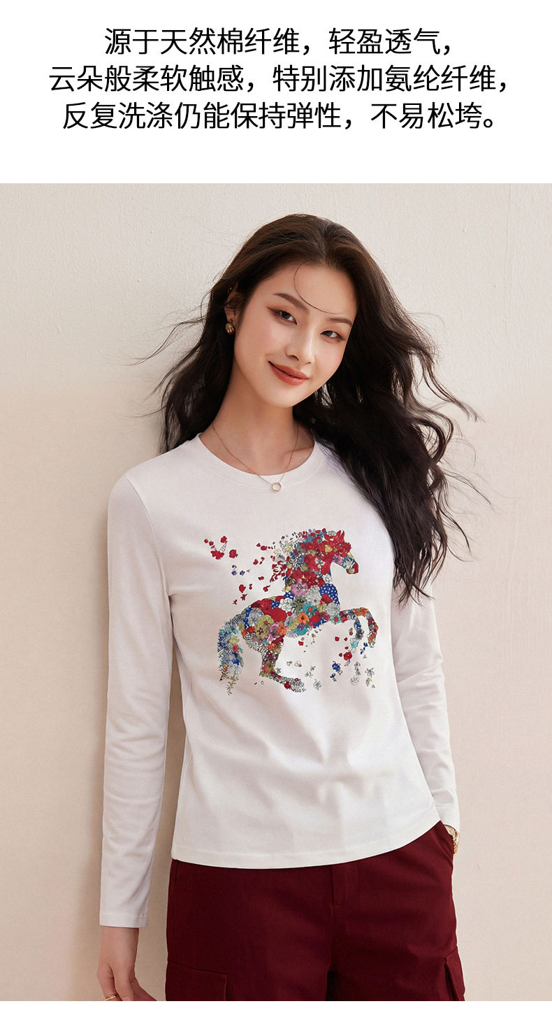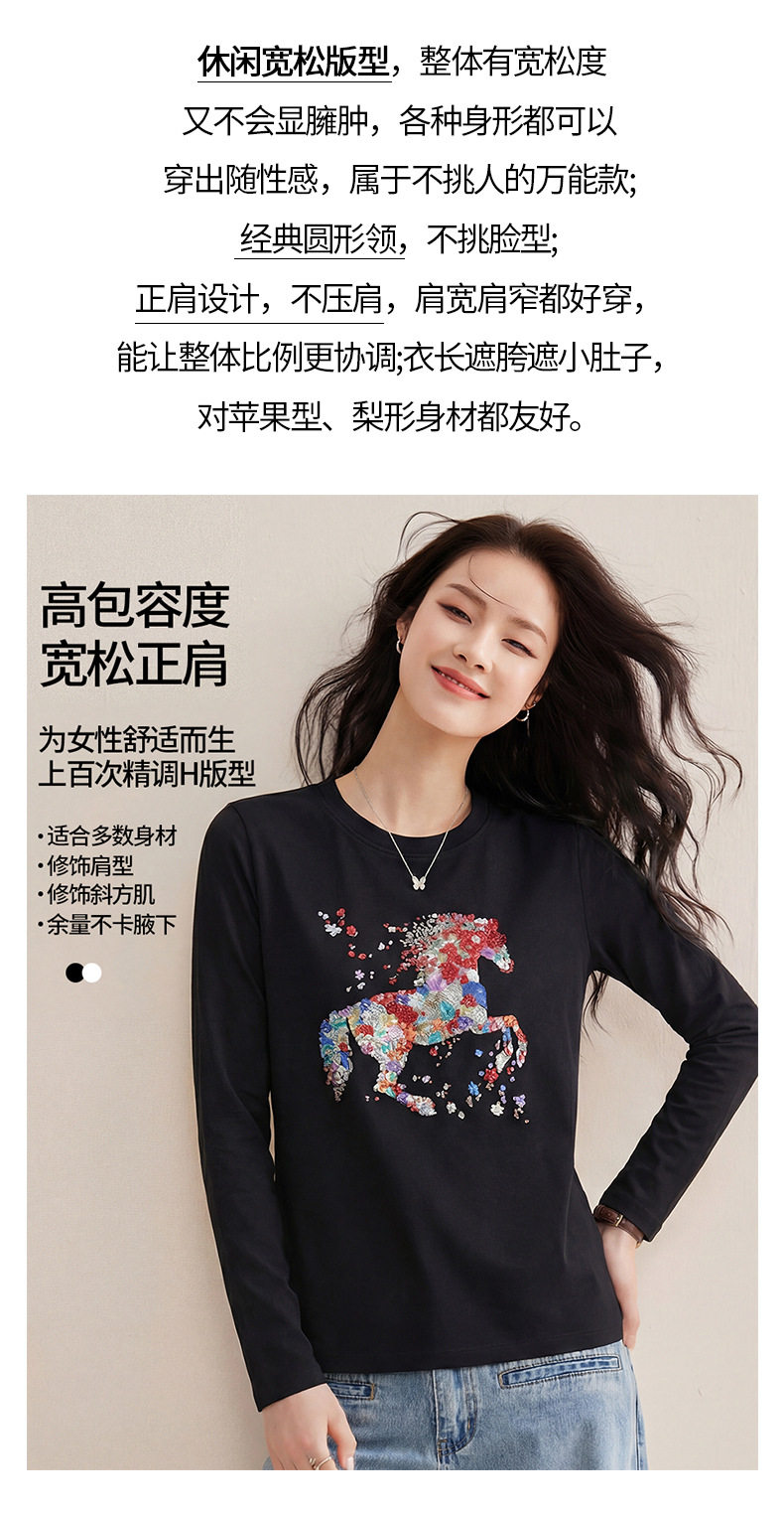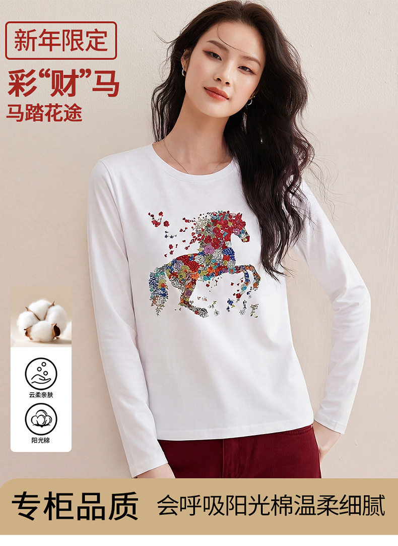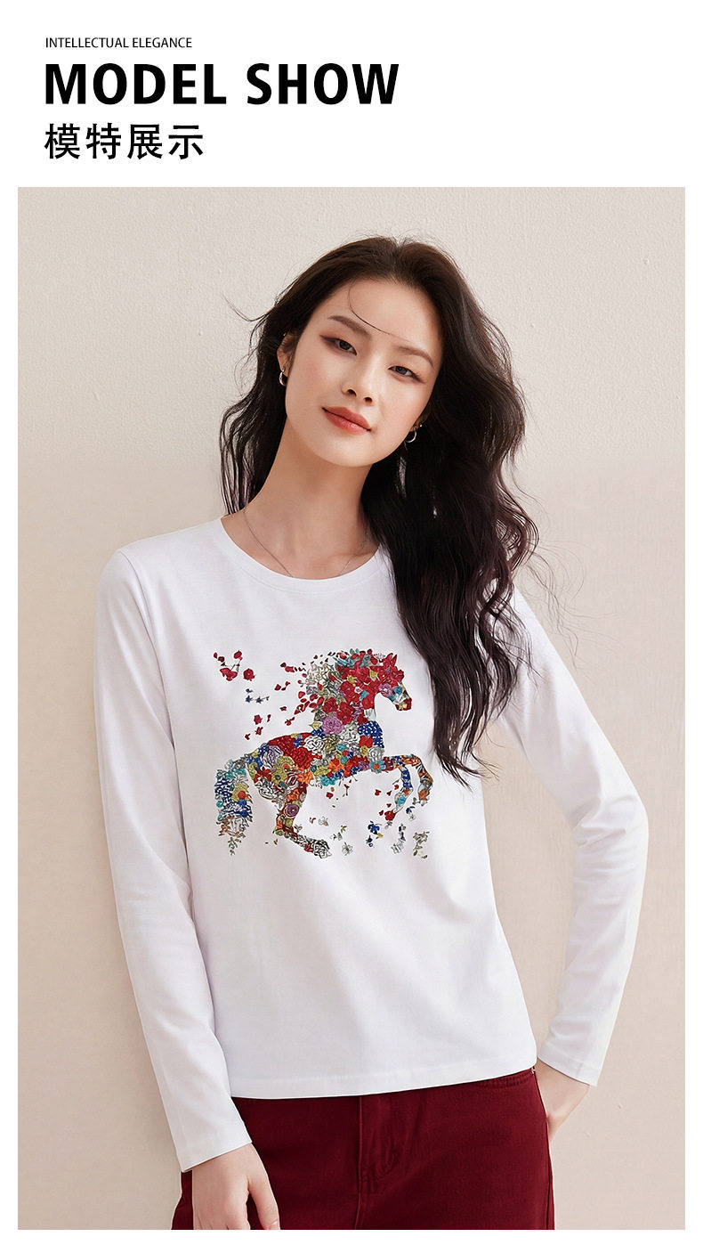 「自j」全新升级【铂金会员119/天猫159/差价40】(94619)洛诗琳烫钻印花小马正肩长袖T恤2026春季修身显瘦磨毛打底衫