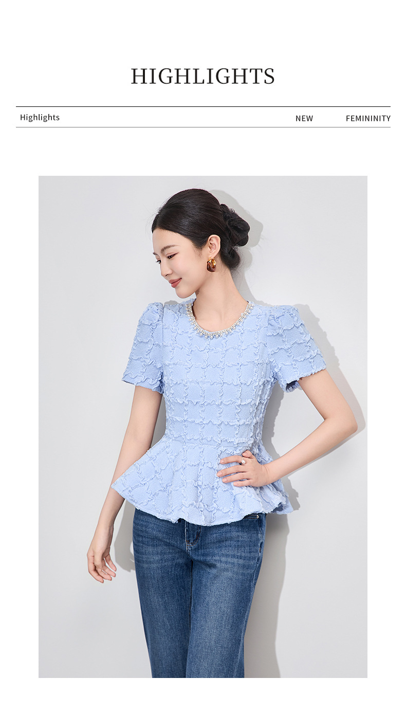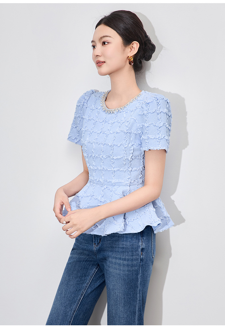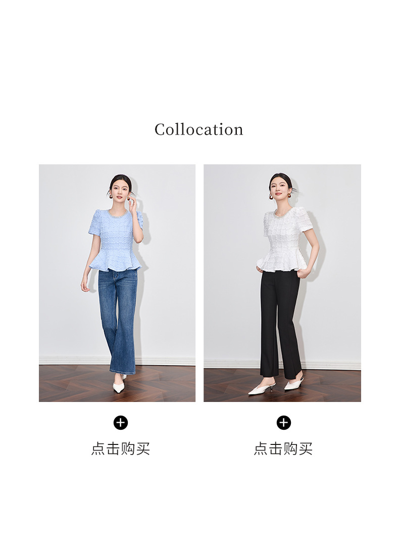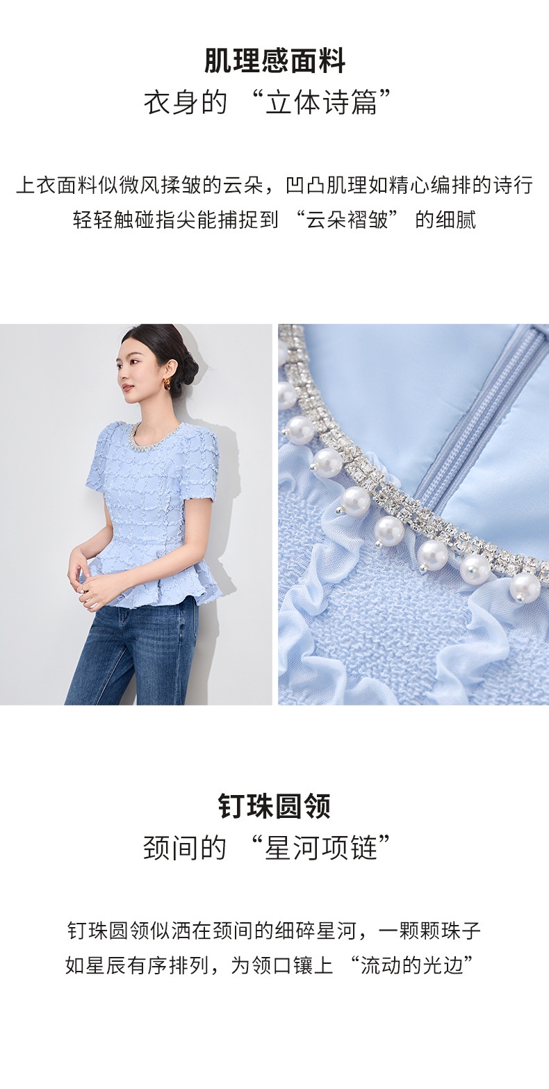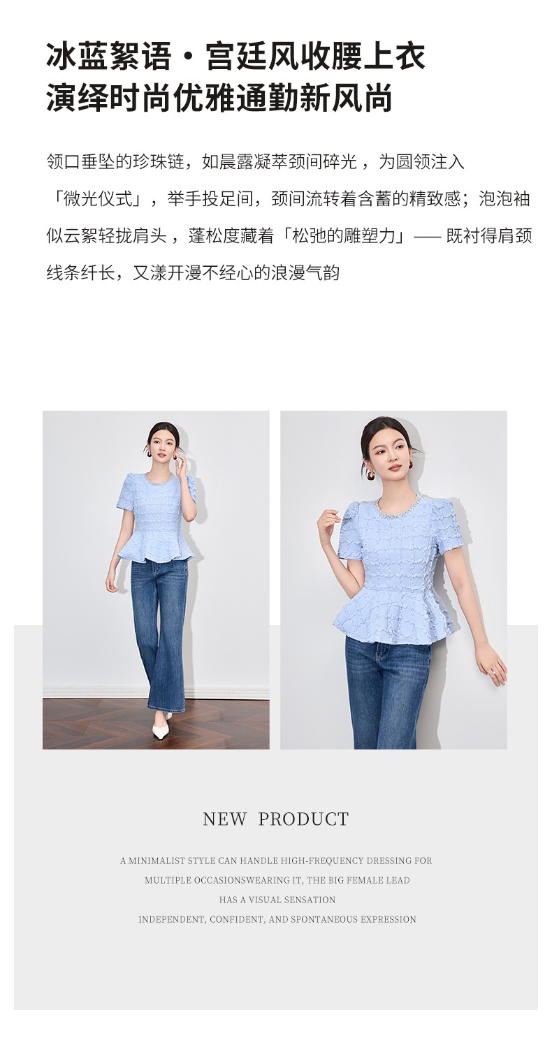 「高货wl」全新升级【铂金会员220/天猫299/差价79】(13126)洛诗琳优雅气质肌理感T恤2025夏款荷叶边收腰鱼尾上衣