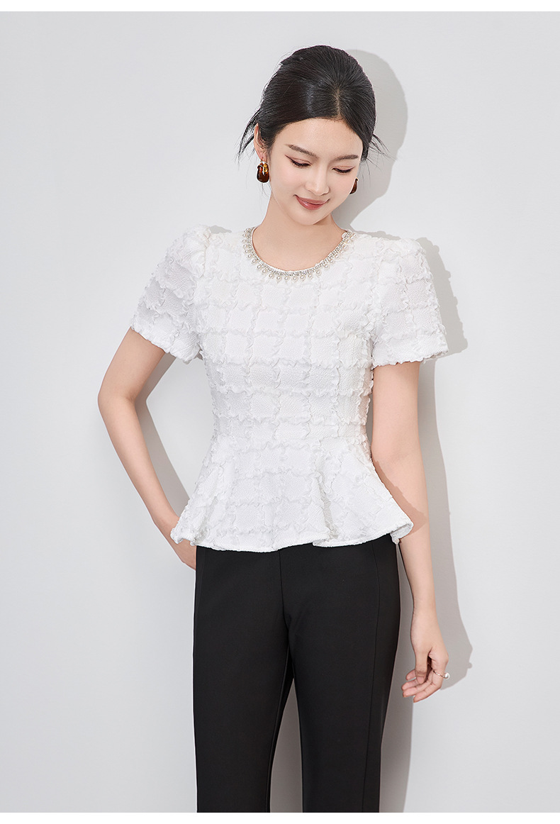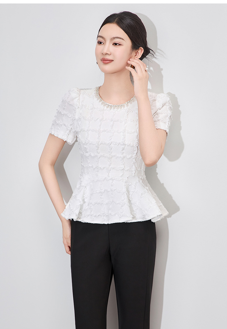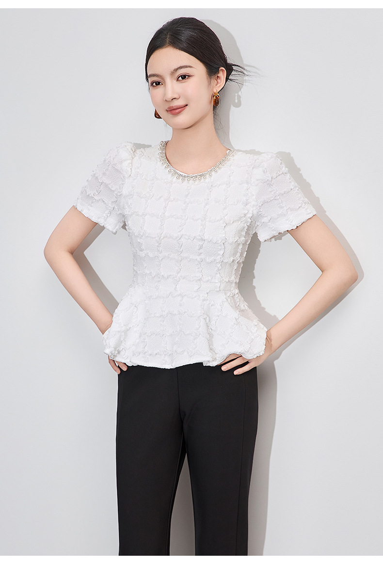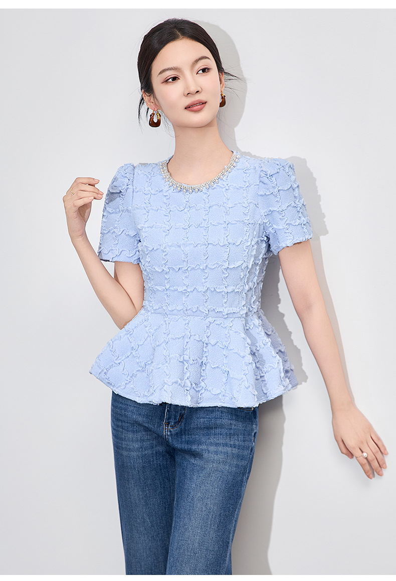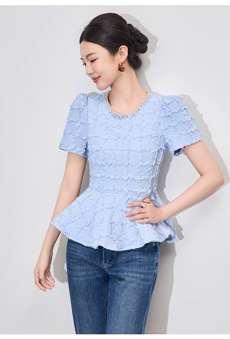 「高货wl」全新升级【铂金会员220/天猫299/差价79】(13126)洛诗琳优雅气质肌理感T恤2025夏款荷叶边收腰鱼尾上衣