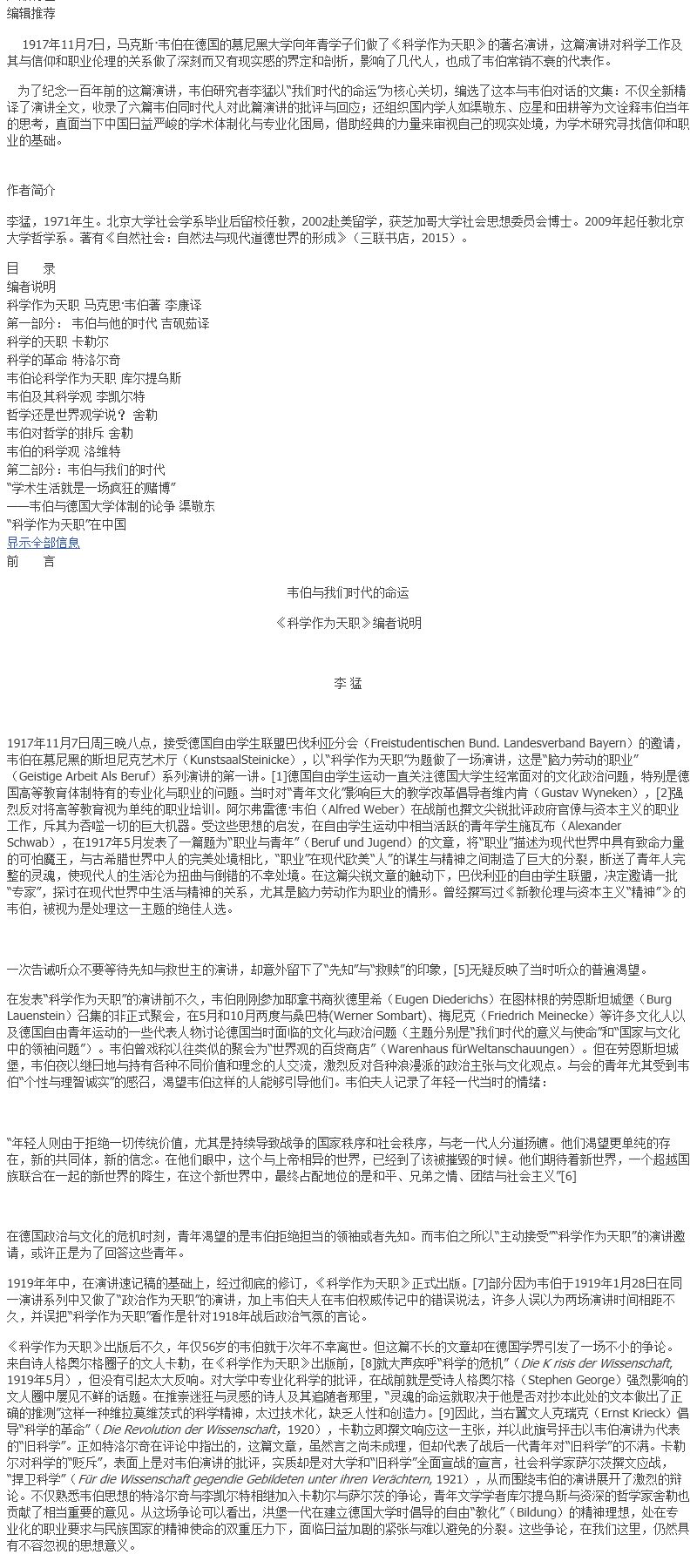 科学作为天职:韦伯与我们时代的命运