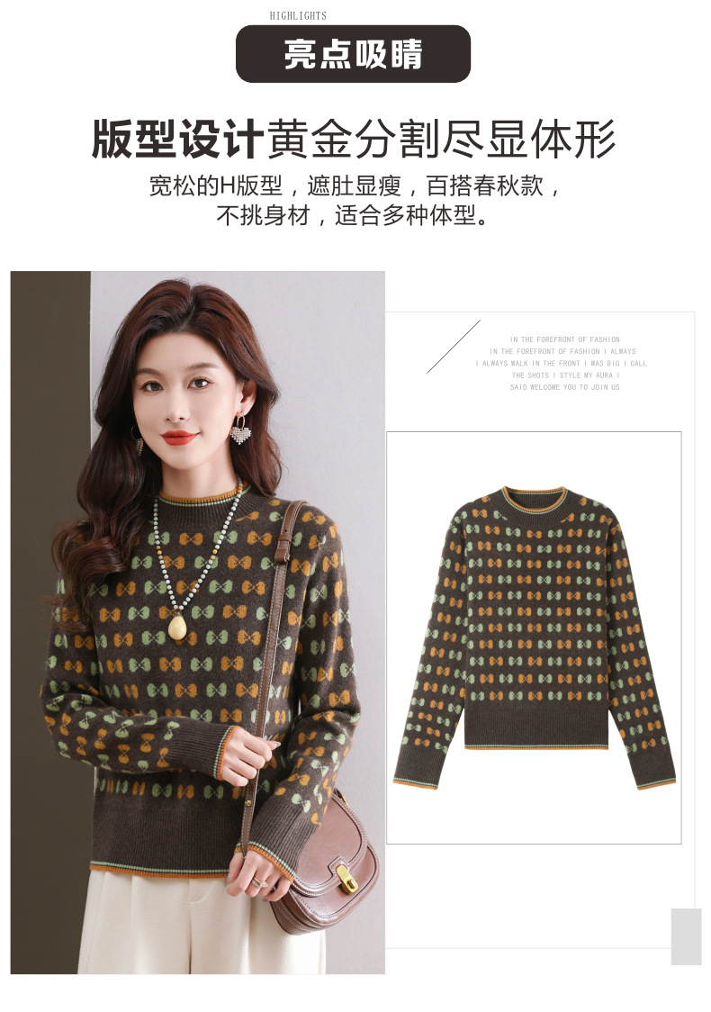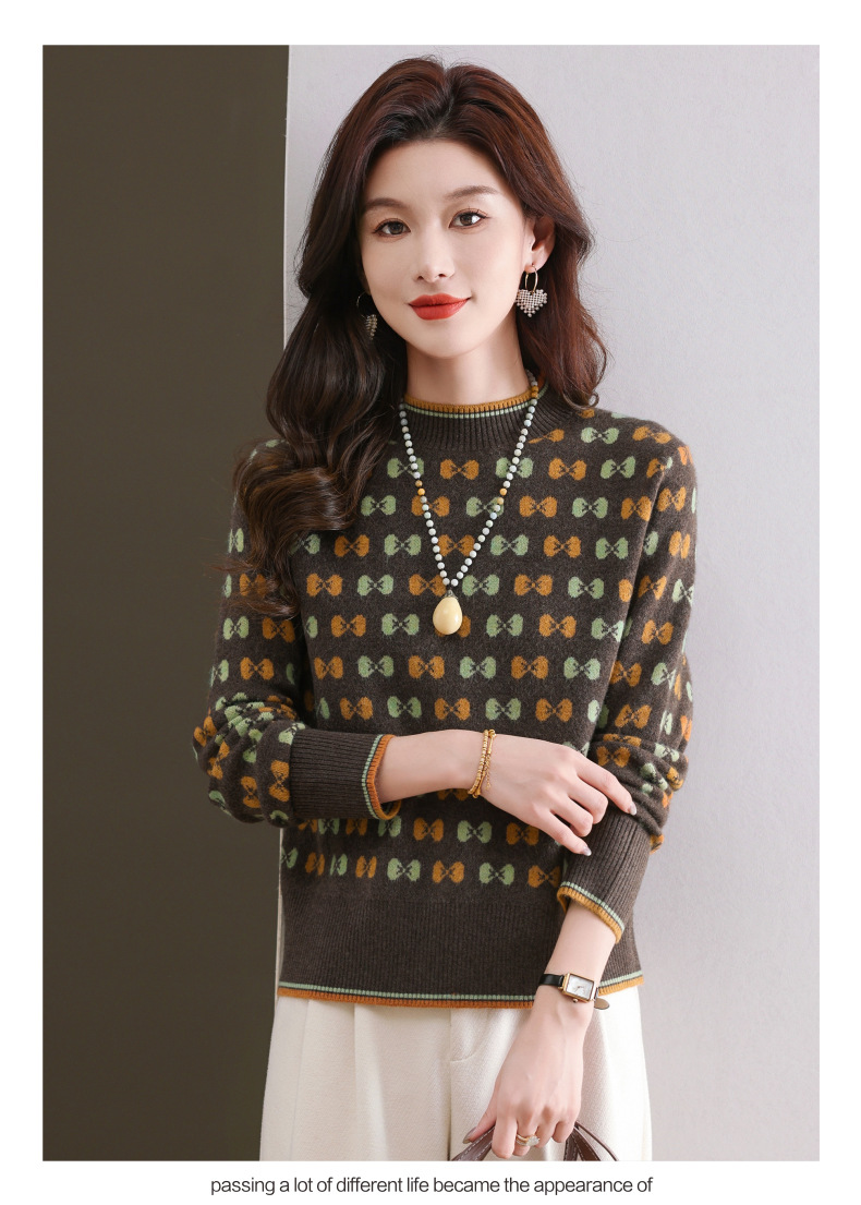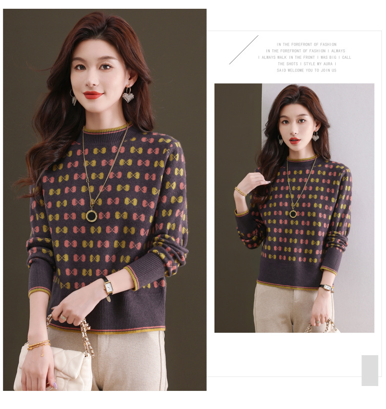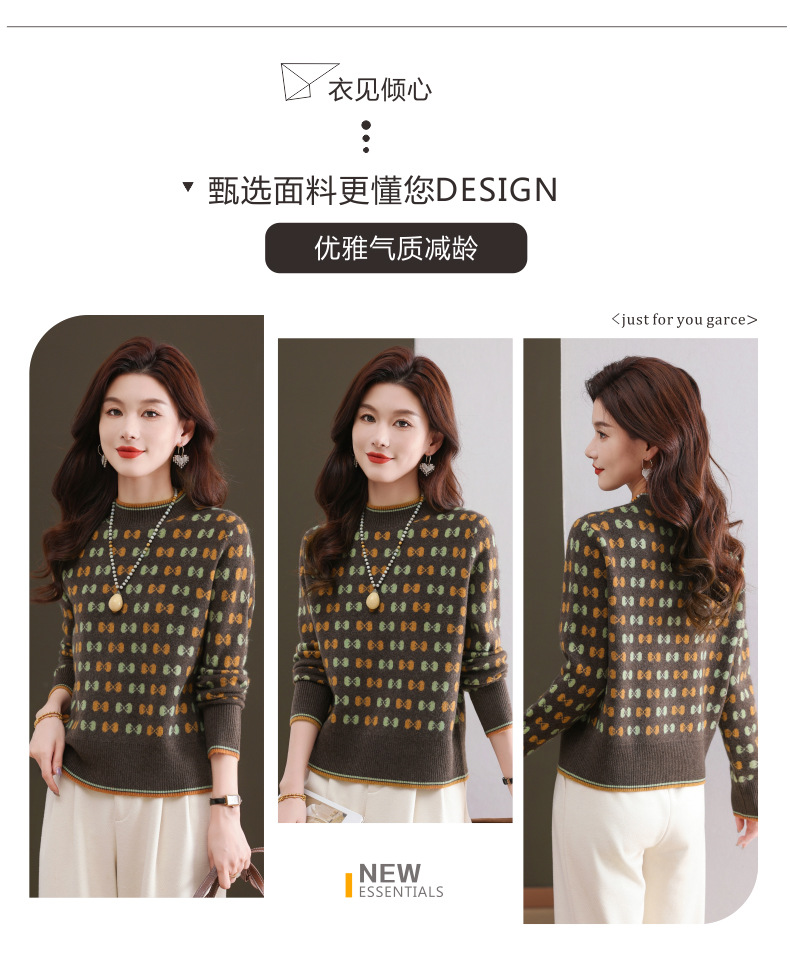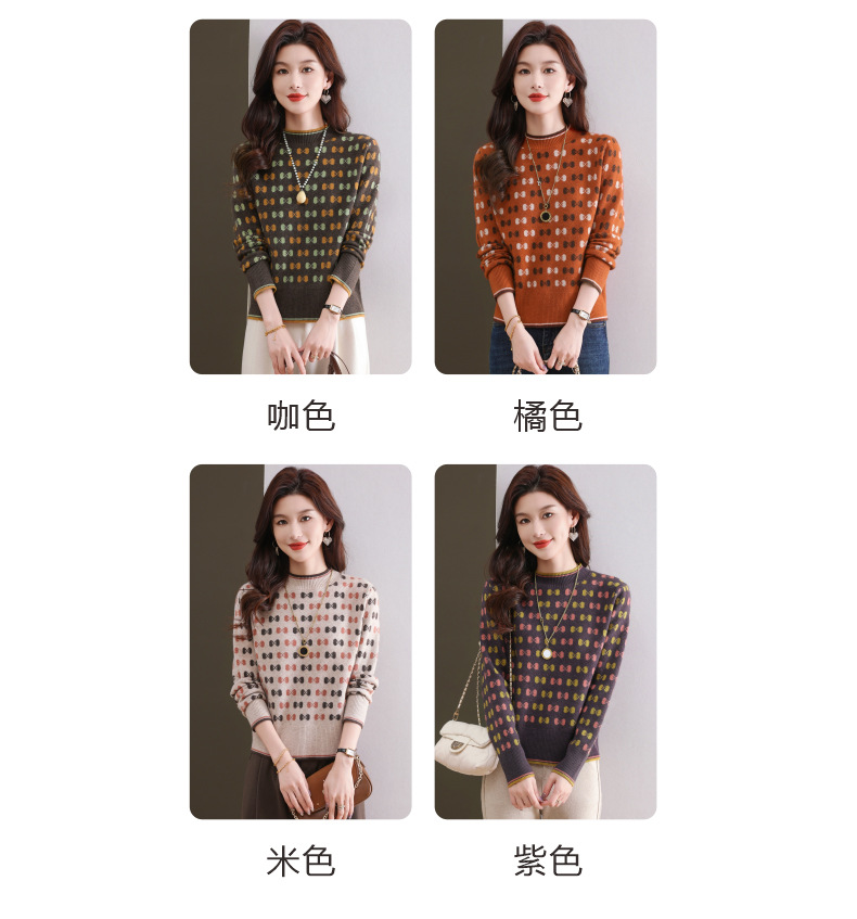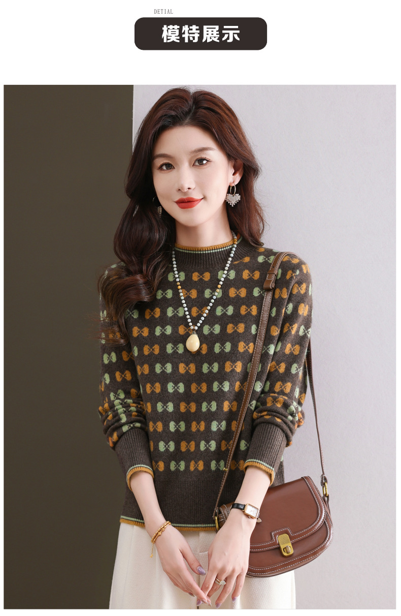CC-101-59858半高领复古毛衣女秋冬2024厚款宽松提花气质内搭中领针织打底衫女