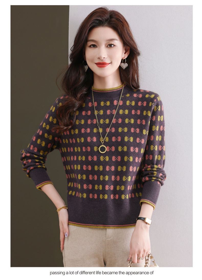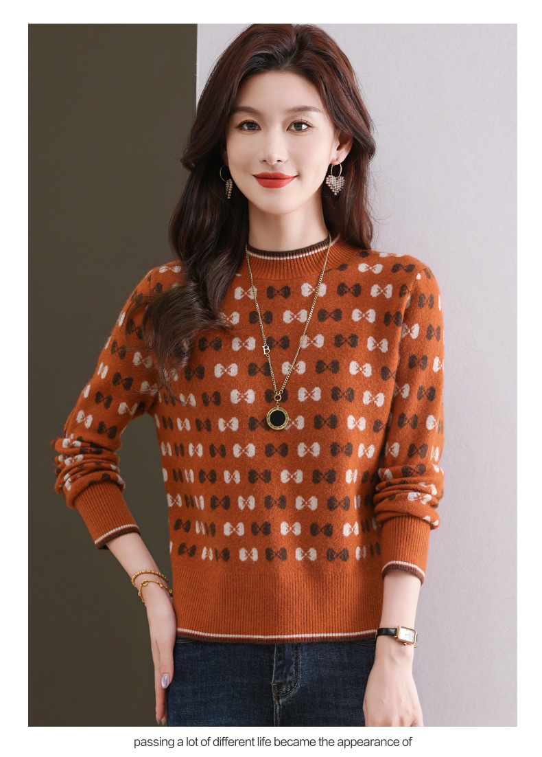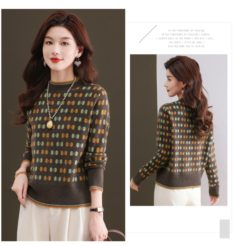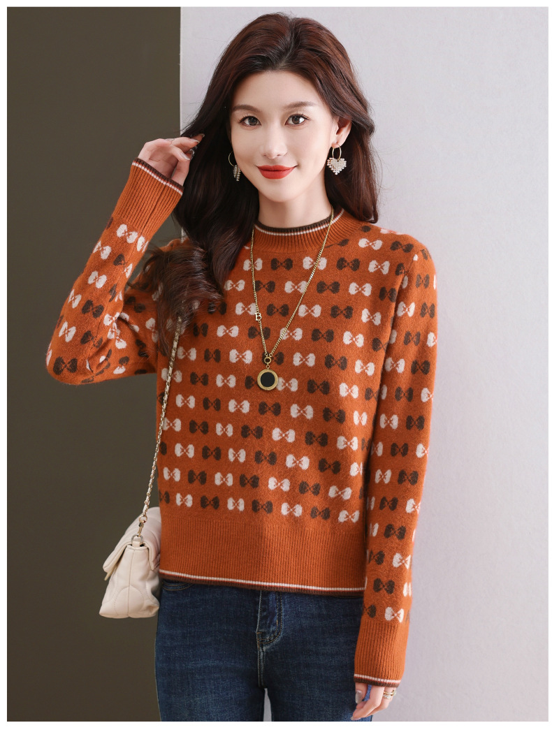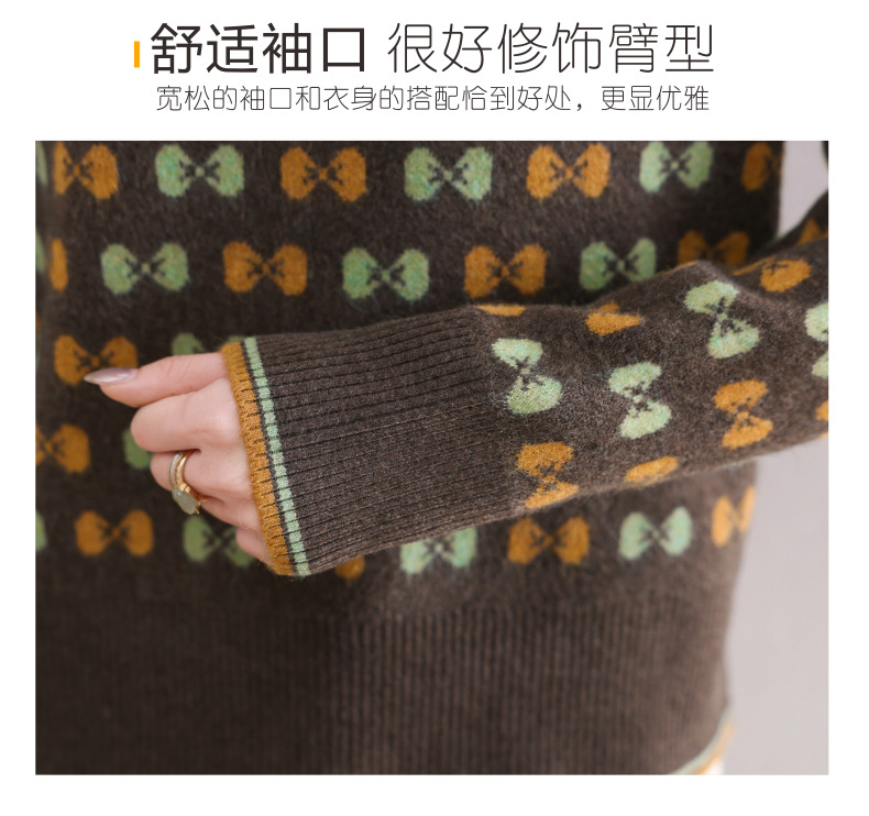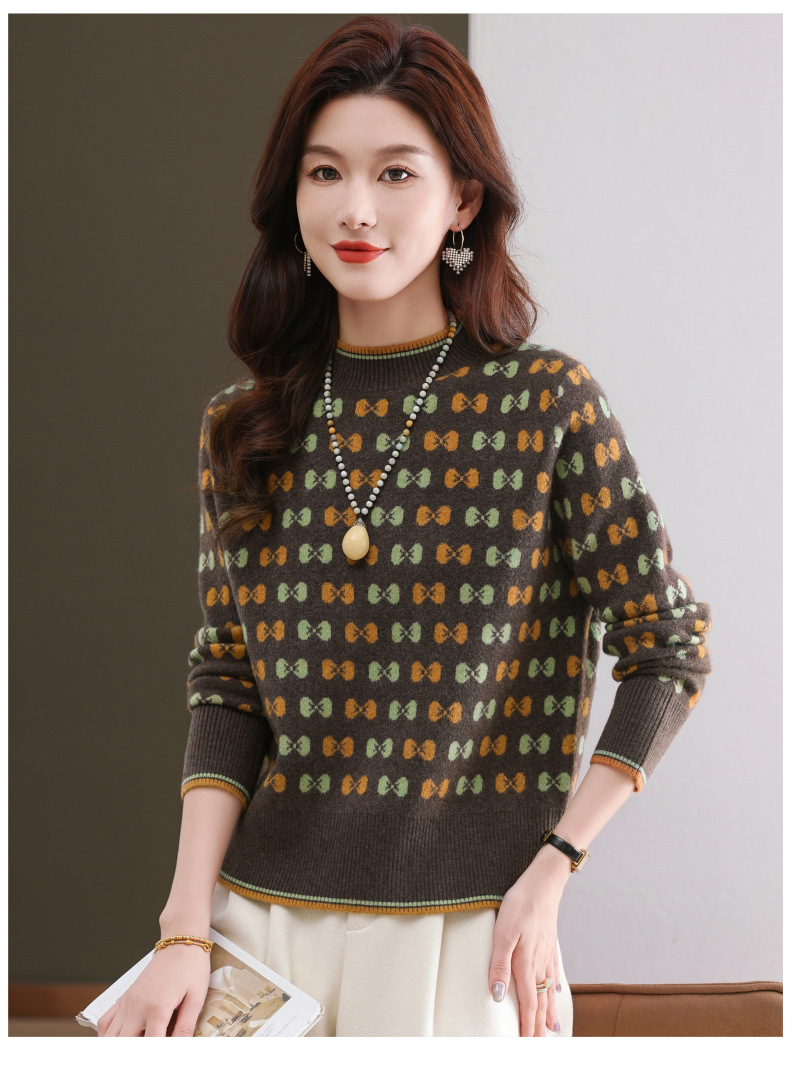 CC-101-59858半高领复古毛衣女秋冬2024厚款宽松提花气质内搭中领针织打底衫女
