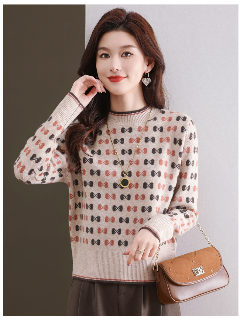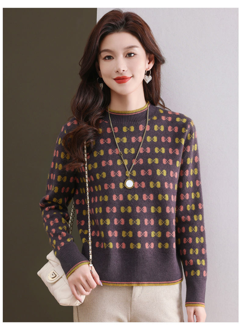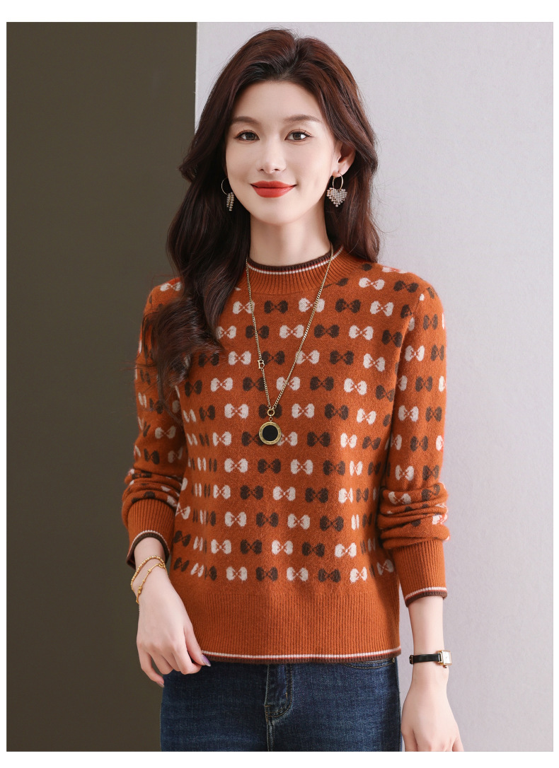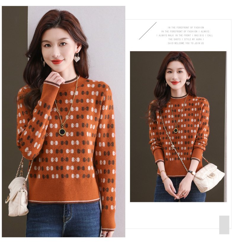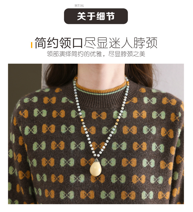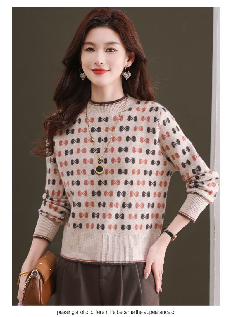 CC-101-59858半高领复古毛衣女秋冬2024厚款宽松提花气质内搭中领针织打底衫女