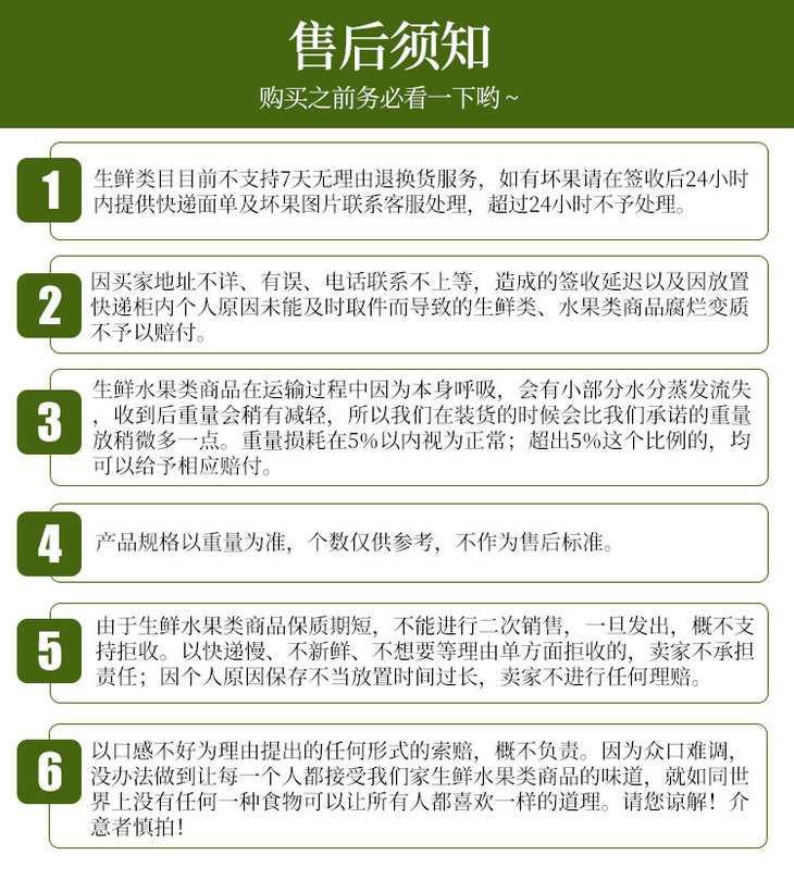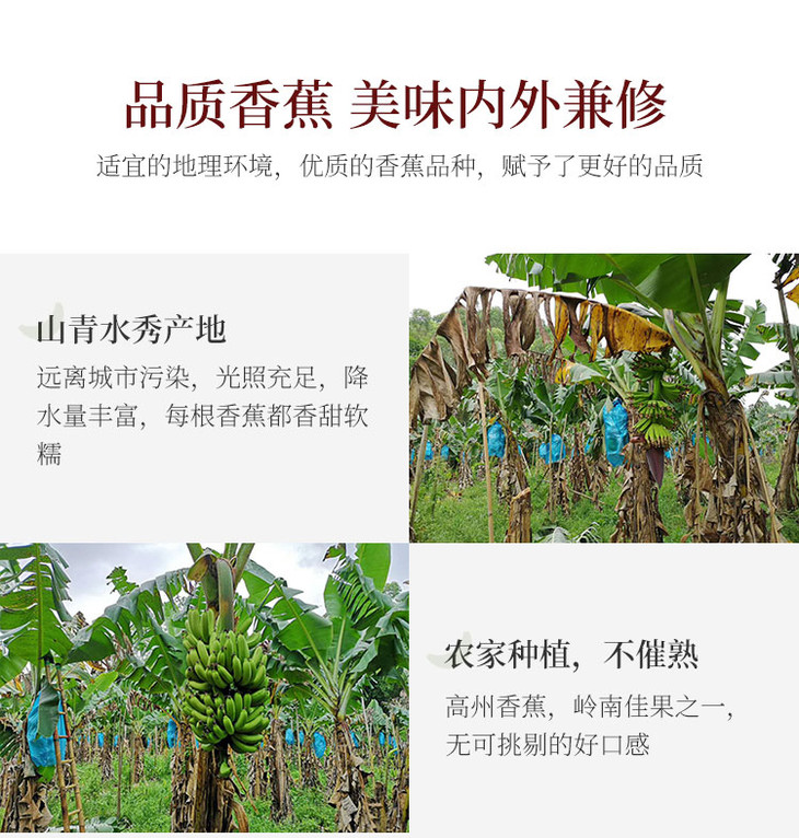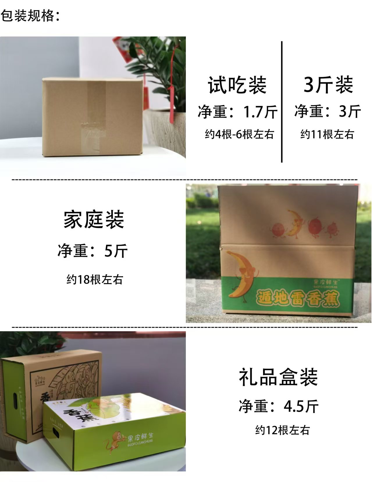 品名:高州遁地雷香蕉 规格1:5斤家庭装(约18根左右;以重量为准) 规格2:4.5斤礼盒装(约12~16根;以重量为准);拍几份发几个包裹,不一定能同时到达,请耐心等待 发货地/产地:广东高州 包装方式:普通箱@礼盒装 物流信息:默认韵达/圆通快递,不支持指定快递 发货区域:新疆、西藏、青海、甘肃、宁夏、内蒙不发;北京+2元; 物流详情:周六、周日及节假日除外,正常48小时内发货,到货时间约为2~5天,请耐心等待 售后说明:收到货后有质量问题,在24小时内都可以拍照(坏品+快递单面箱子一起拍)上传,申请按坏品比例理赔或联系客服,生鲜性质特殊,不支持7天无理由退换货;因地址错误,手机号联系不上,拒收等造成的损失无法售后,请理解; |