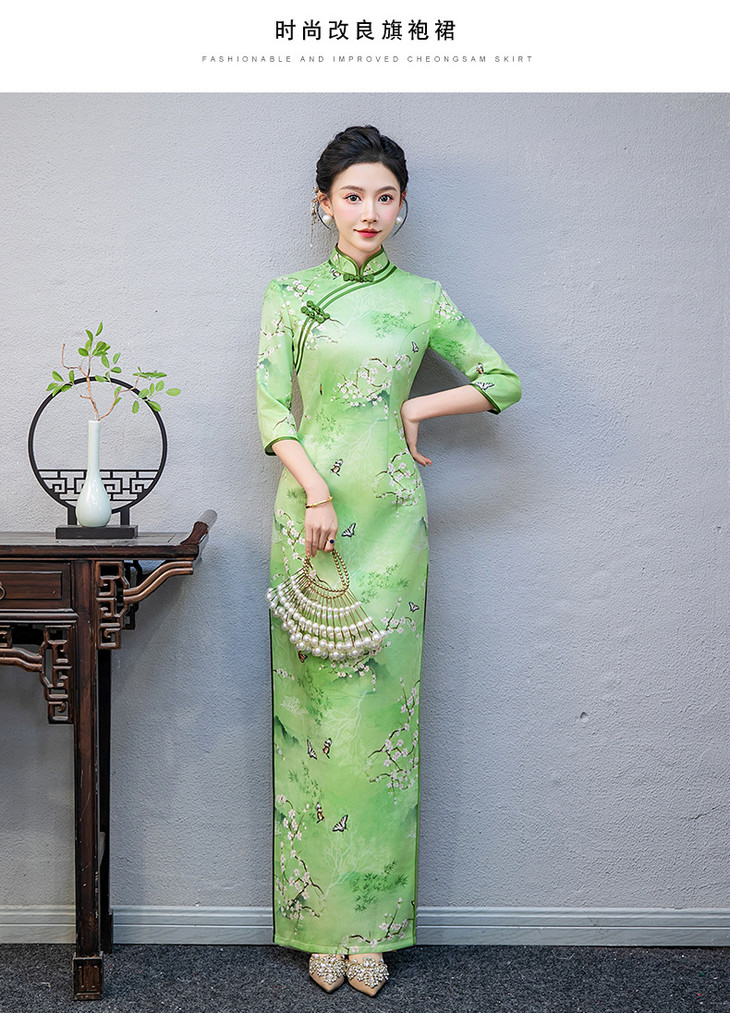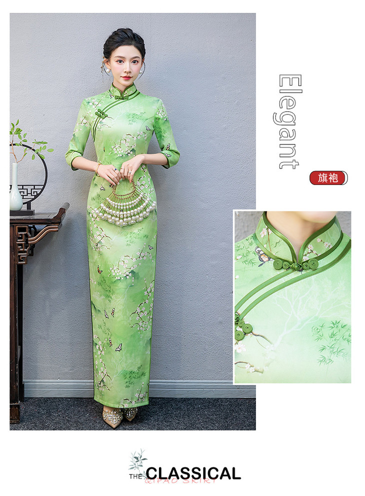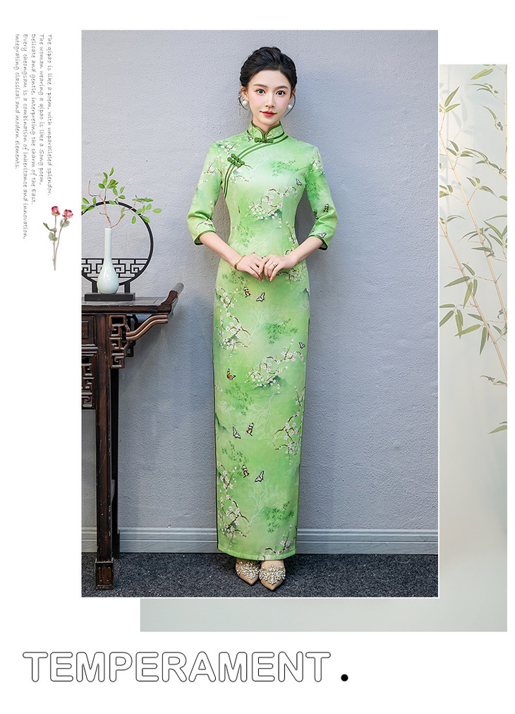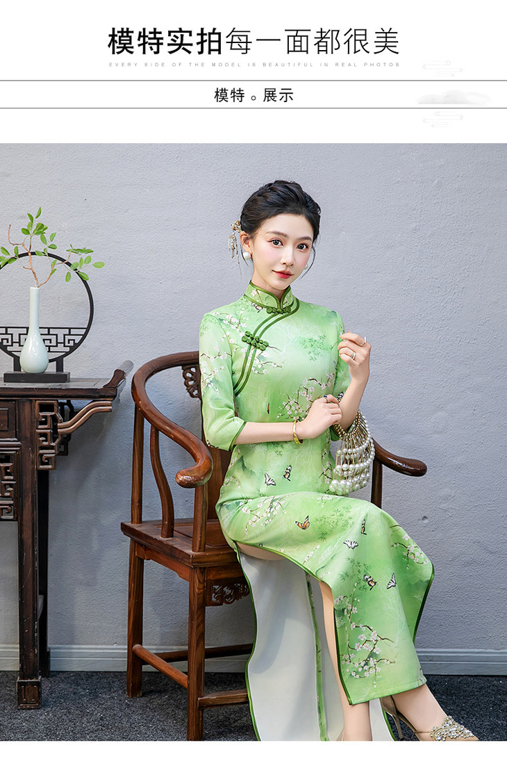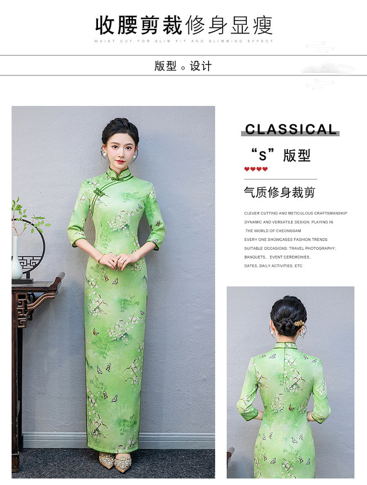 优雅走秀汉服七分袖修身演出服中式长款改良旗袍QC179