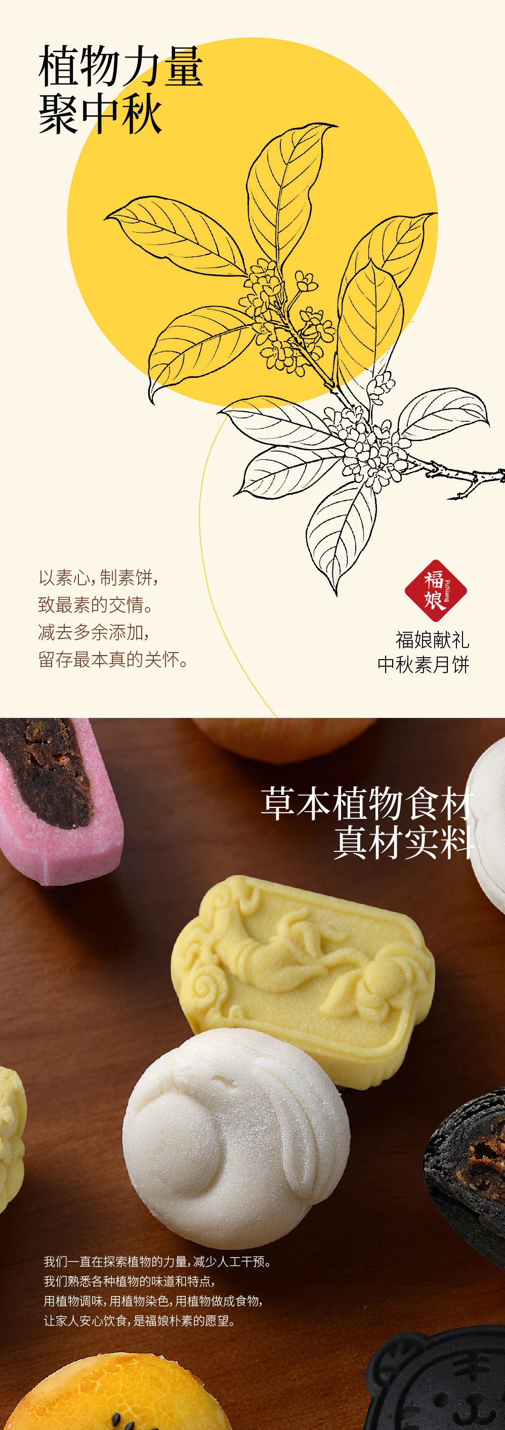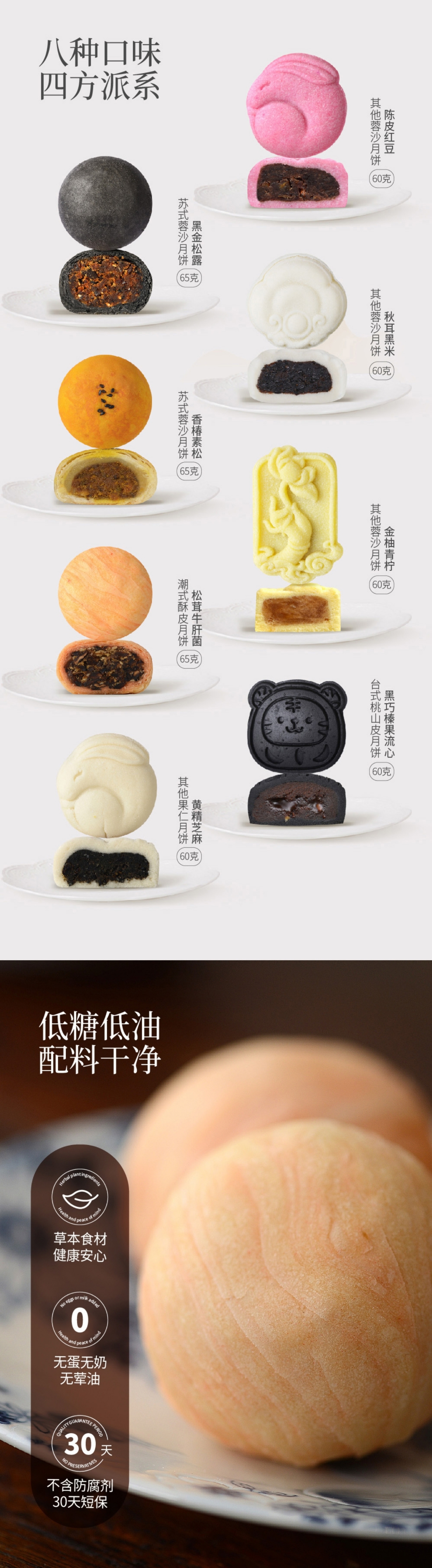 产品特点:一款好看、好吃、健康、安全的纯素月饼, 甄选天然食材,不添加防腐剂。少油少糖少盐,坚守纯素、无添加。让食材更养生、味道更好吃。