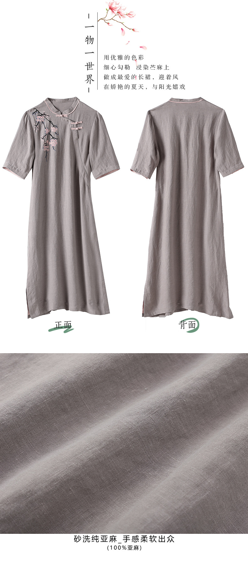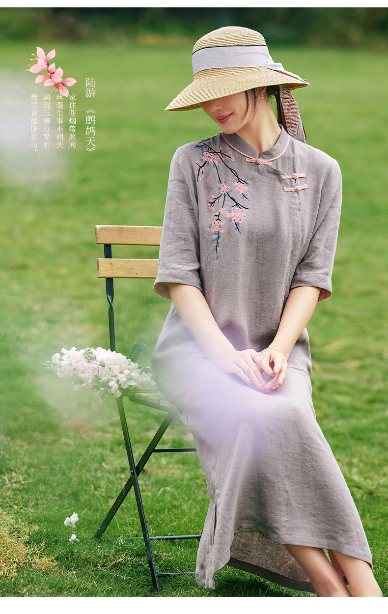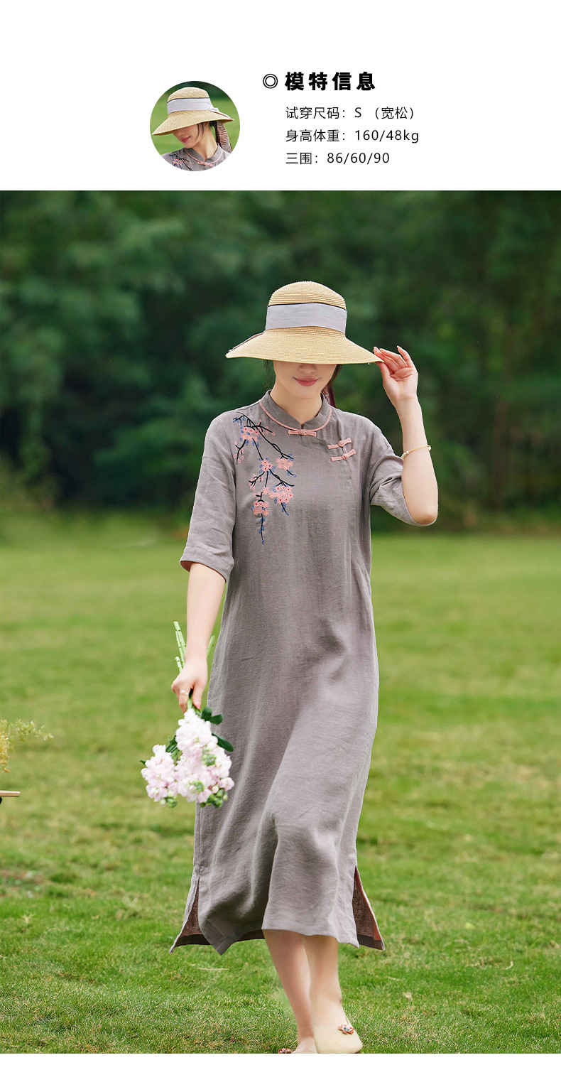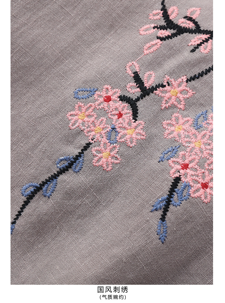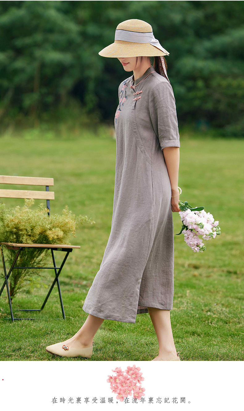 HM-C006春夏原创新款国风刺绣古典改良旗袍立领亚麻连衣裙一步裙