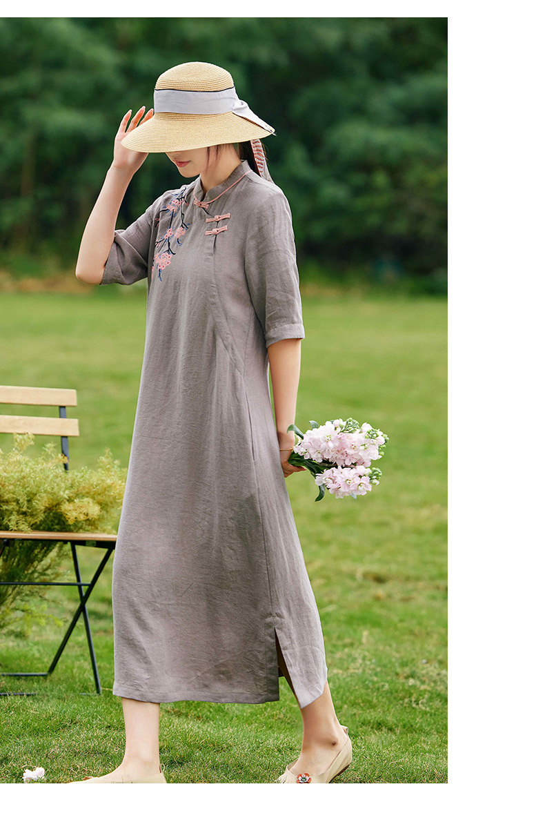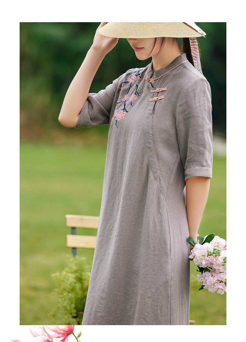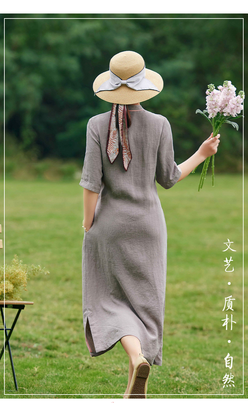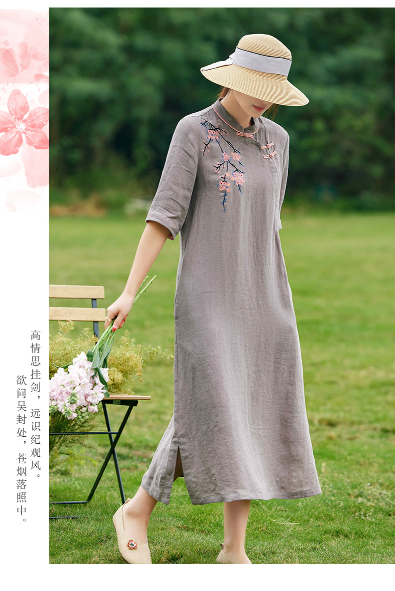 HM-C006春夏原创新款国风刺绣古典改良旗袍立领亚麻连衣裙一步裙