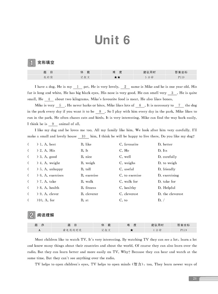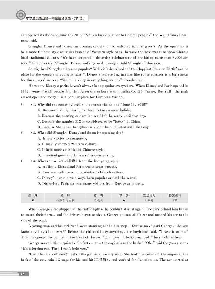 改版修订,替换陈旧的内容,编入更多最新的阅读材料。全书共分26个单元,以新课标及最新考纲为依据,采取“首字母+完形填空+阅读理解+任务型阅读”四合为一的编写体例,涵盖初中阶段的阅读类相关题型。