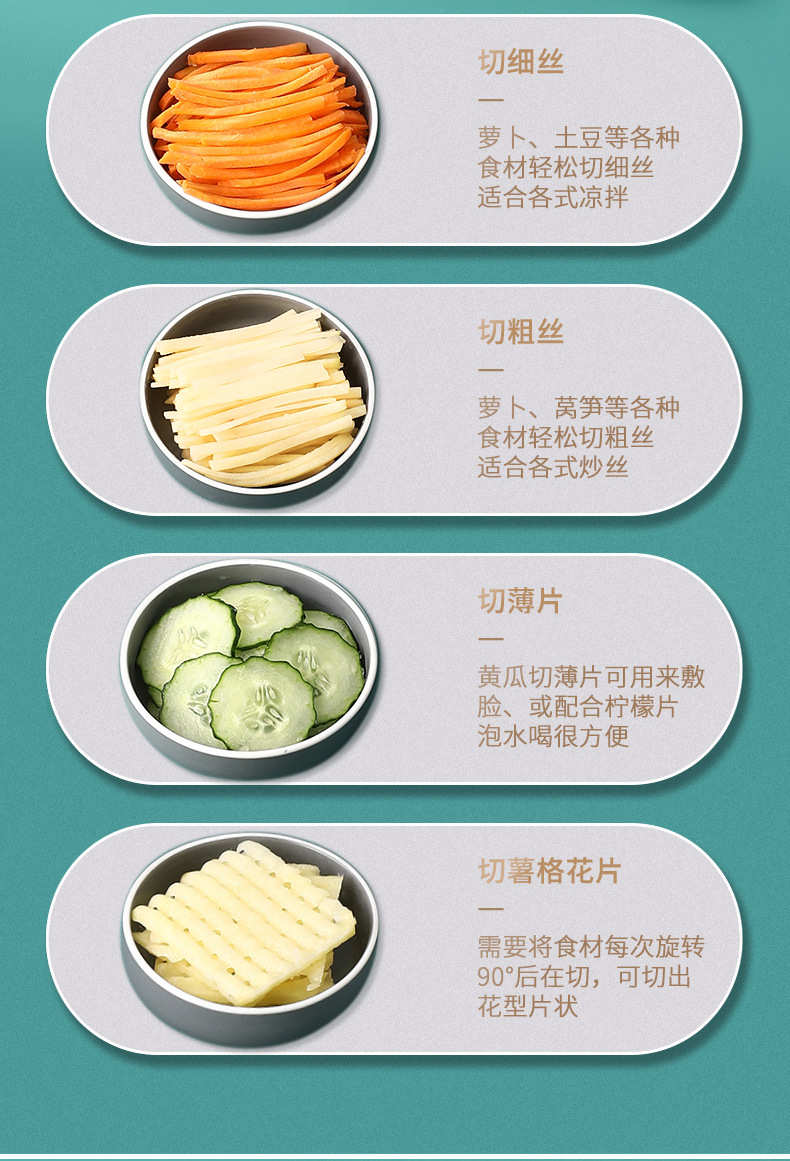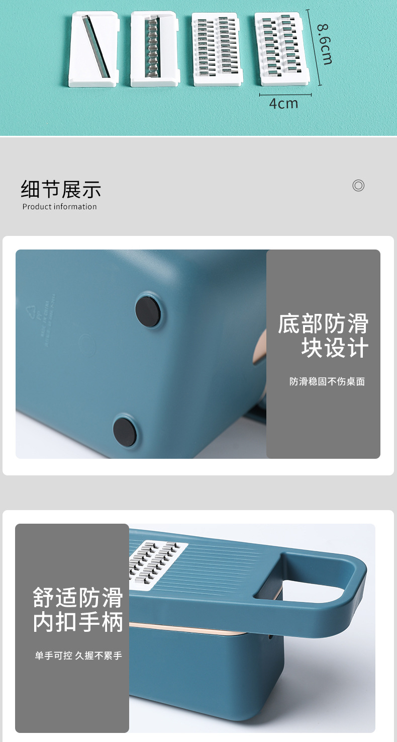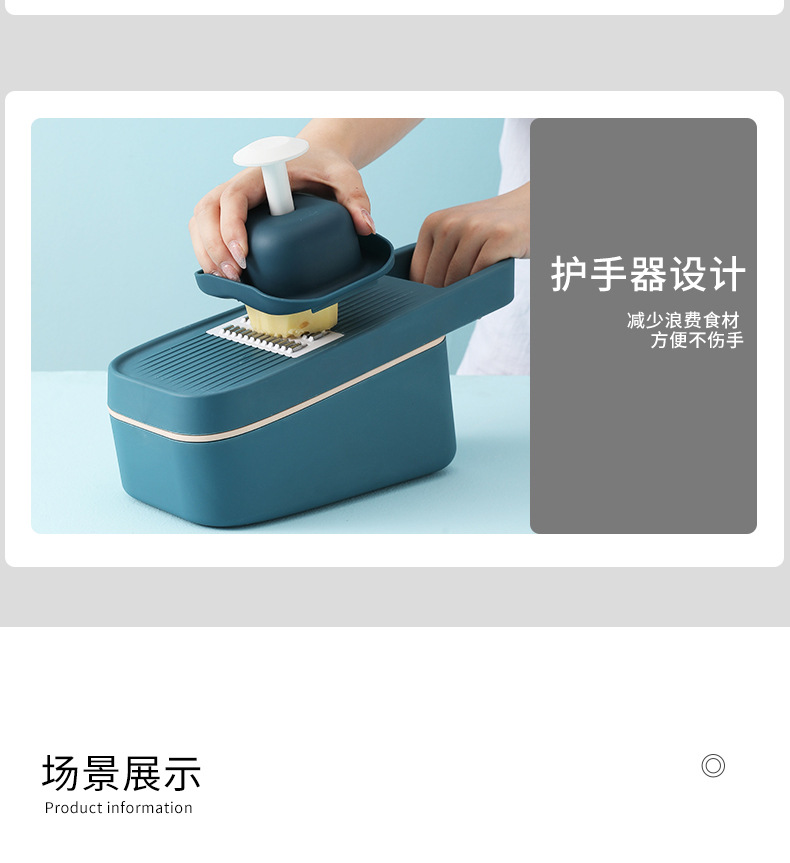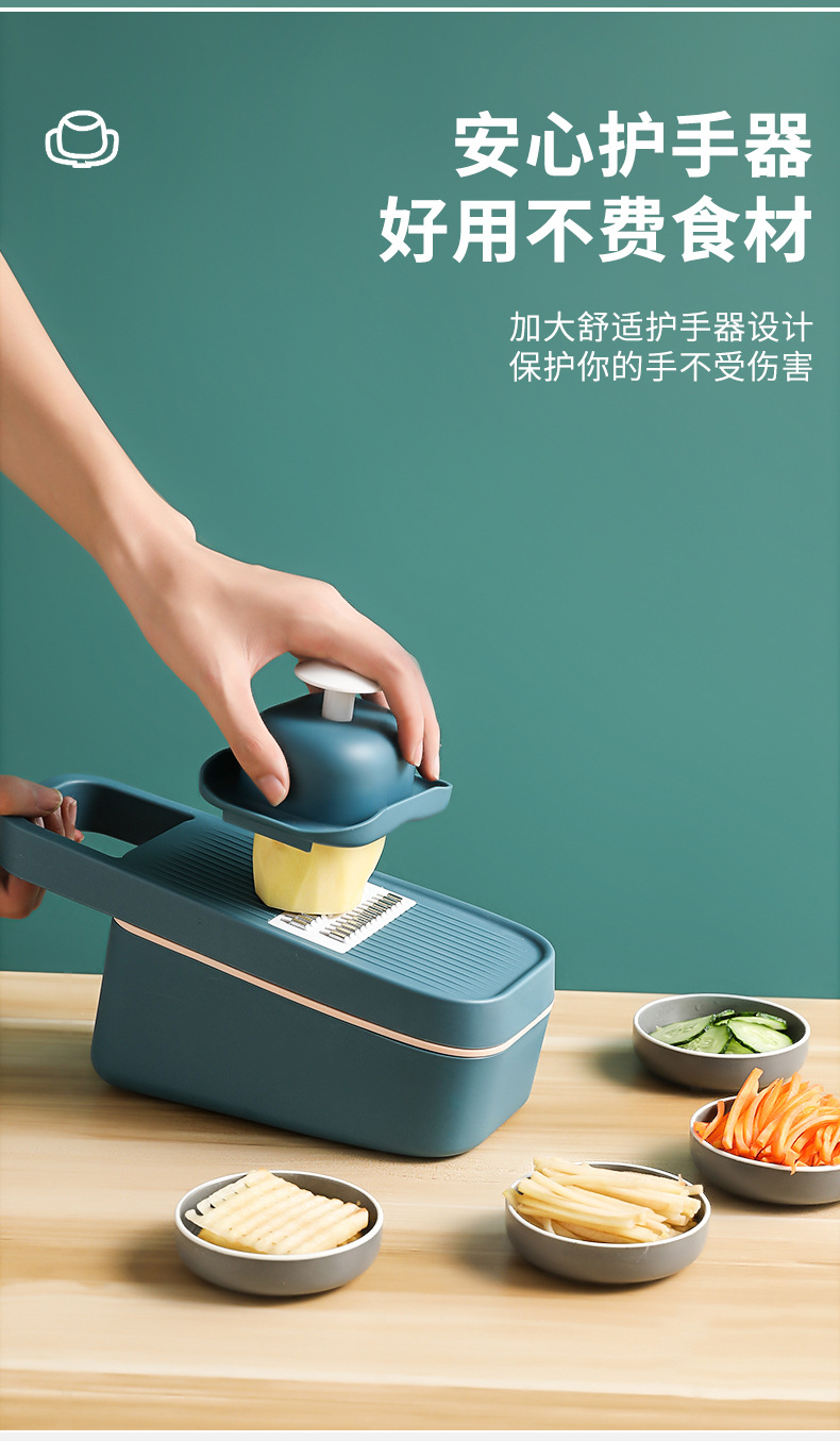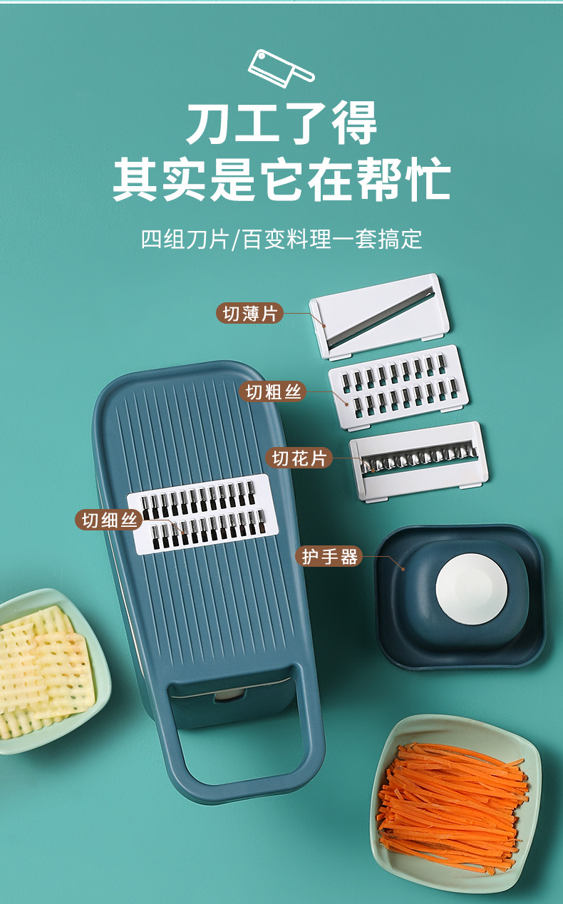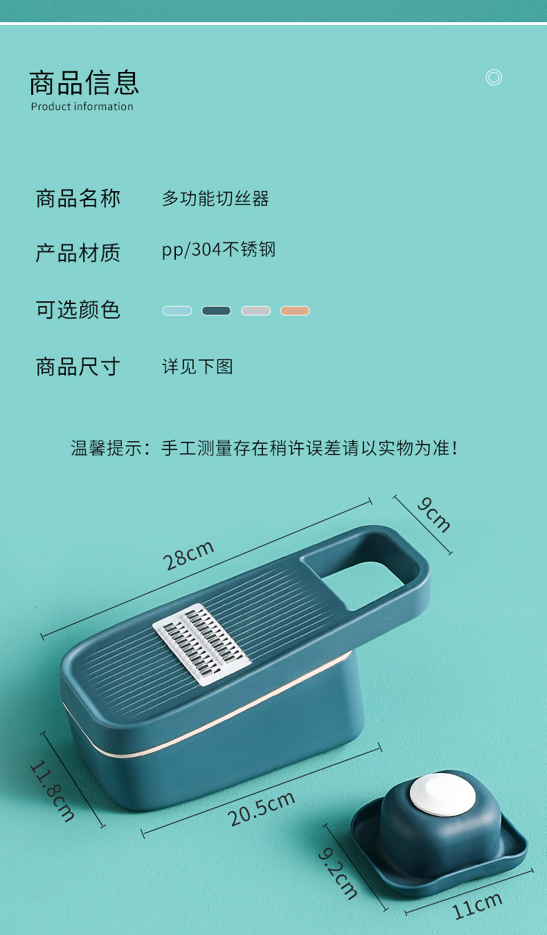 参数: 产品名称:切丝器、切菜器 产品尺寸:长28*手把长9+前宽11.8 护手器 约长11*9.2 配件切片约8.6*4cm 产品重量:420g 产品材质:pp 产品包装:OPP袋+纸盒 箱装数:48/箱 装箱尺寸:52.5*53*91cm 颜色:灰、天空蓝、樱花粉、海洋蓝 摆地摊货源 跨境