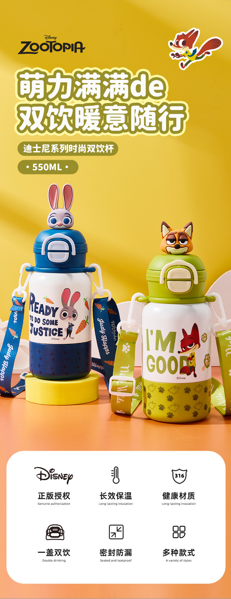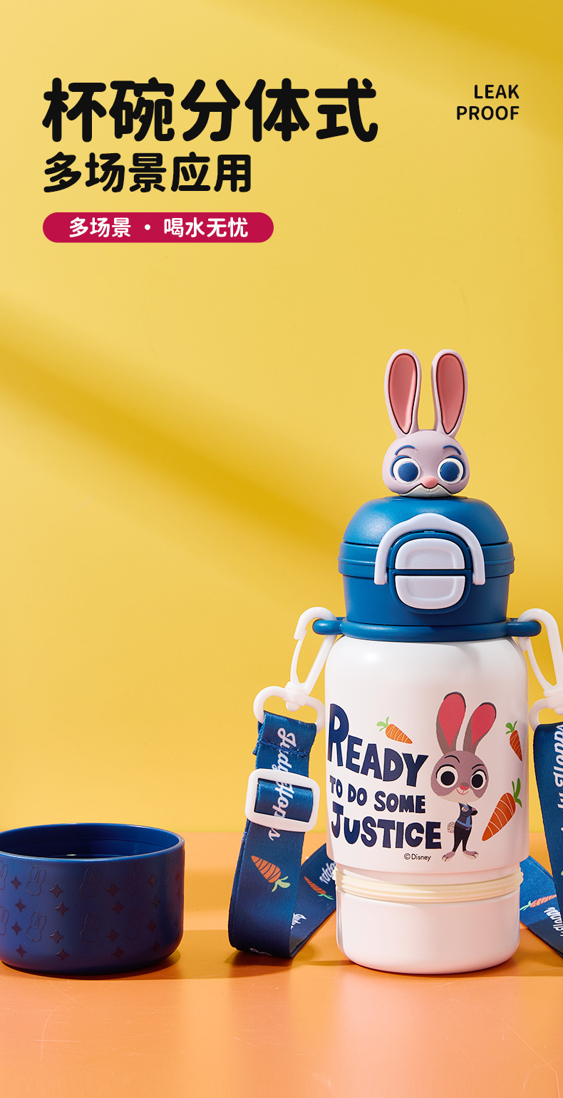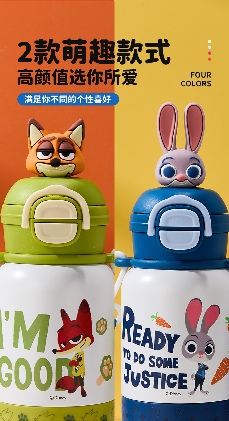 【一盖双饮❗️萌力满满】迪士尼儿童保温杯疯狂动物城上学专用带杯绳双饮水杯男女吸管杯子。jb