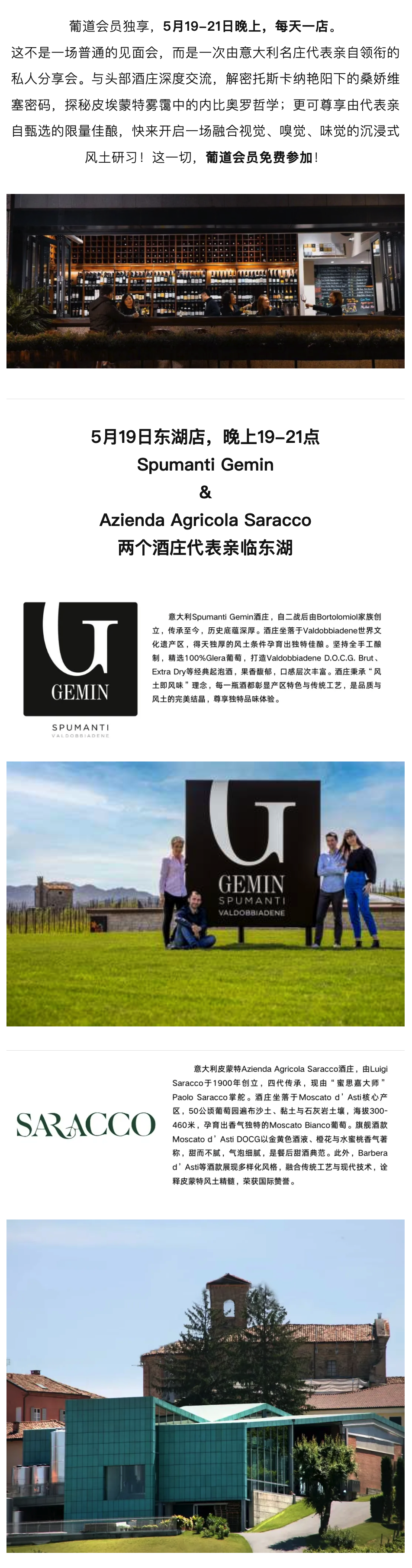 【2025.05.19 东湖门票 Donghu Ticket】两个酒庄代表亲临东湖|Spumanti Gemin & Azienda Agricola Saracco