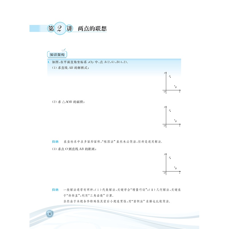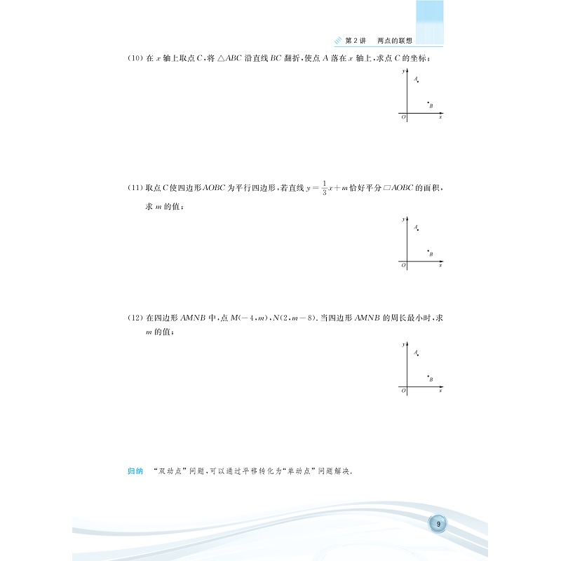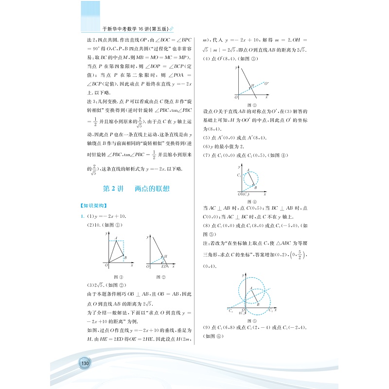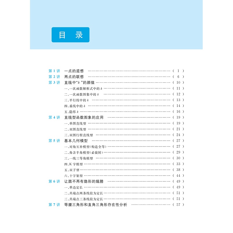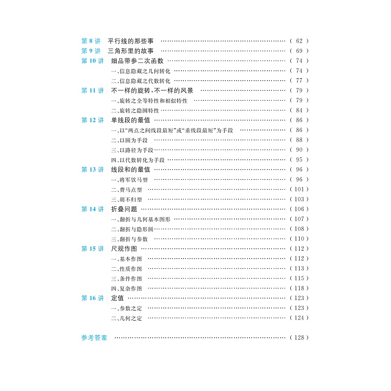 编者结合二十多年教学、辅导和命题经验,通过16讲突破学生的认识和解题的技能,对传统的中考二轮复习进行尝试性变革.如《第1讲:一点的遐想》和《第2讲:两点的联想》,让同学们见点、识点、用点,形成对参数点的整体认识;又如《第3讲:直线中“k”的颜值》,让学生认识到直线中的“k”的几何意义,犹如直线下方悬挂了一串串相似的直角三角形;再如《第6讲:让圆不再有隐形的翅膀》,让同学们发现问题中的隐形圆,将隐形圆显性化,让思维长出翅膀,解决问题,等等.